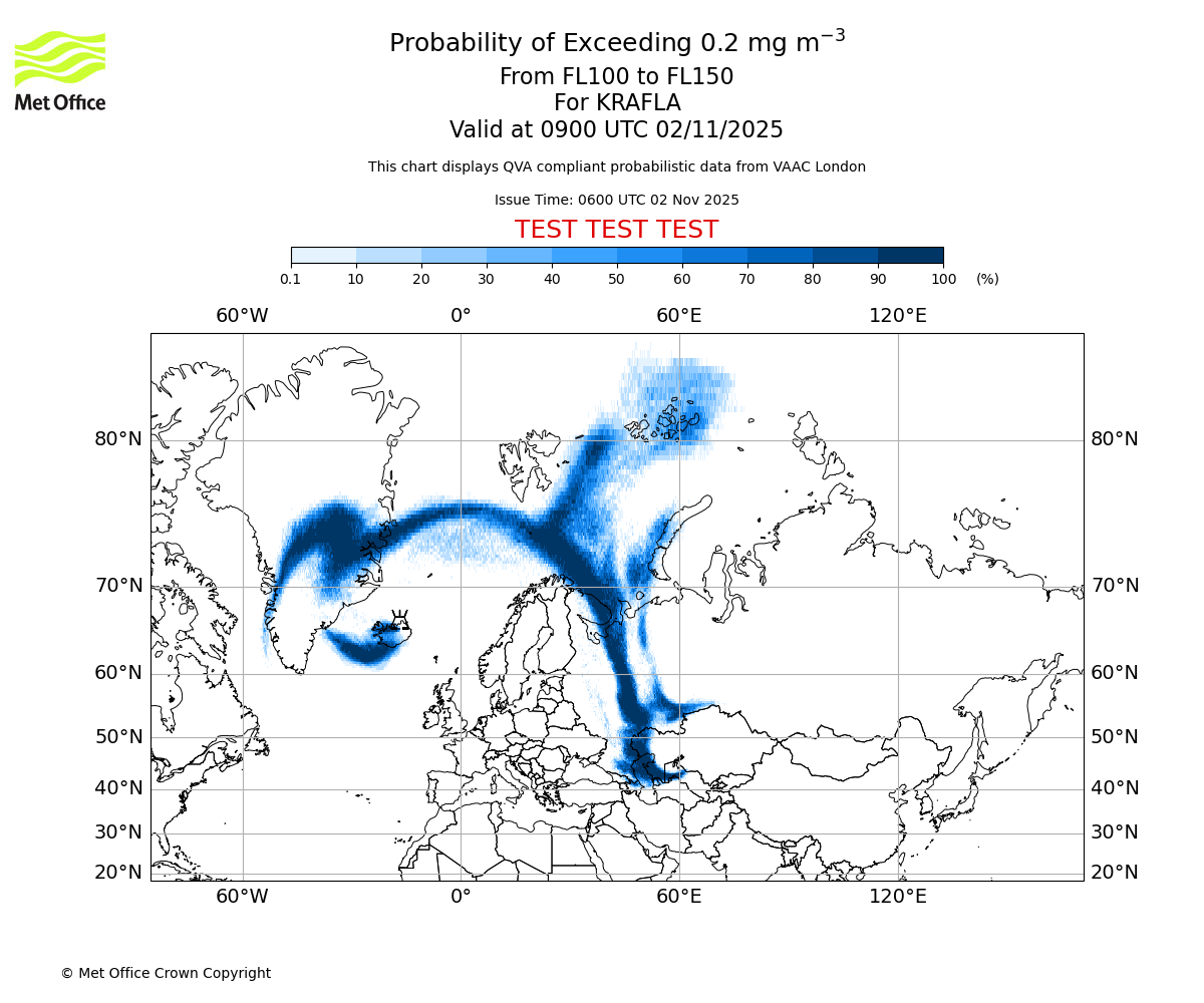 In accordance with ICAO Annex 3, Amendment 82 VAAC London will provide operational QVA forecasts from 27 November 2025 and these will be made available via a VAAC London QVA API information service. These charts are currently provided for test and evaluation purposes (not for operational use) until the introduction of the operational service.