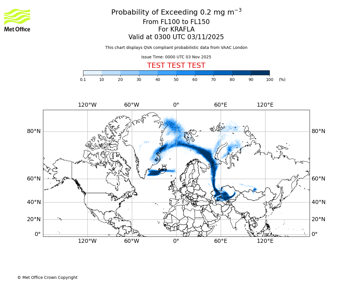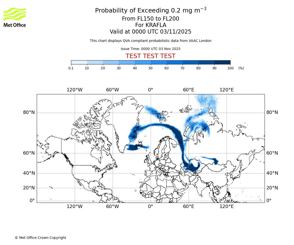 In accordance with ICAO Annex 3, Amendment 82 VAAC London will provide operational QVA forecasts from 27 November 2025 and these will be made available via a VAAC London QVA API information service. These charts are currently provided for test and evaluation purposes (not for operational use) until the introduction of the operational service.