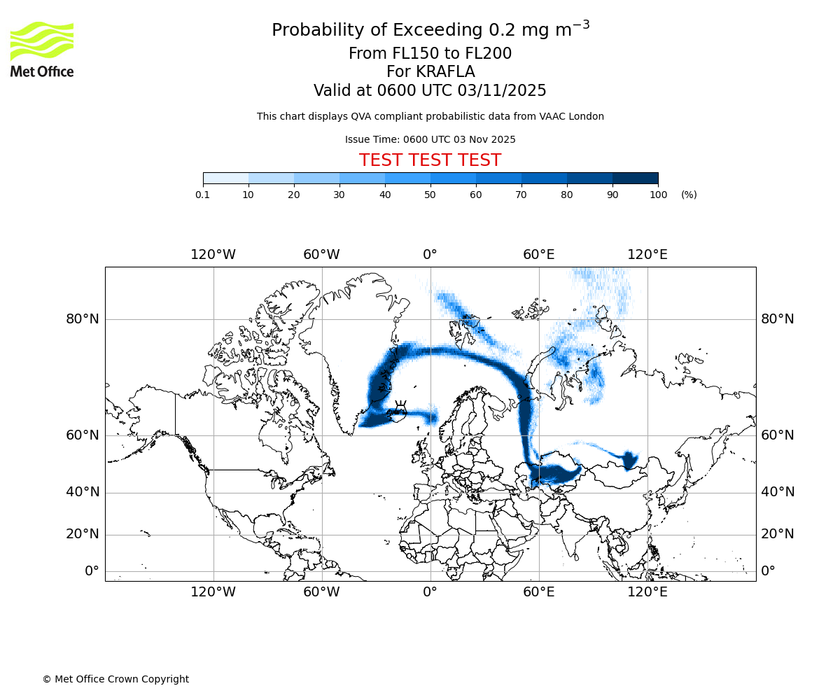 In accordance with ICAO Annex 3, Amendment 82 VAAC London will provide operational QVA forecasts from 27 November 2025 and these will be made available via a VAAC London QVA API information service. These charts are currently provided for test and evaluation purposes (not for operational use) until the introduction of the operational service.