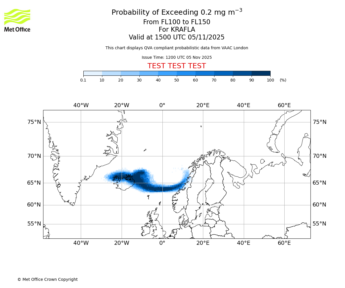 In accordance with ICAO Annex 3, Amendment 82 VAAC London will provide operational QVA forecasts from 27 November 2025 and these will be made available via a VAAC London QVA API information service. These charts are currently provided for test and evaluation purposes (not for operational use) until the introduction of the operational service.