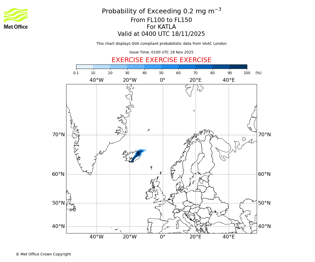 Probability of exceeding 0.2 milligrams per metre cubed. From 100 to 150 for KATLA. Valid at 0100 UTC 18/11/2025