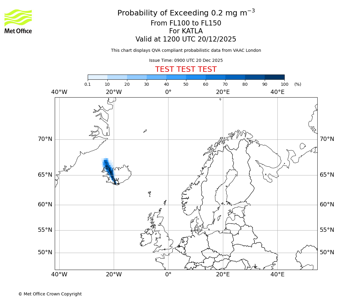 Probability of exceeding 0.2 milligrams per metre cubed. From 100 to 150 for KATLA. Valid at 0900 UTC 20/12/2025