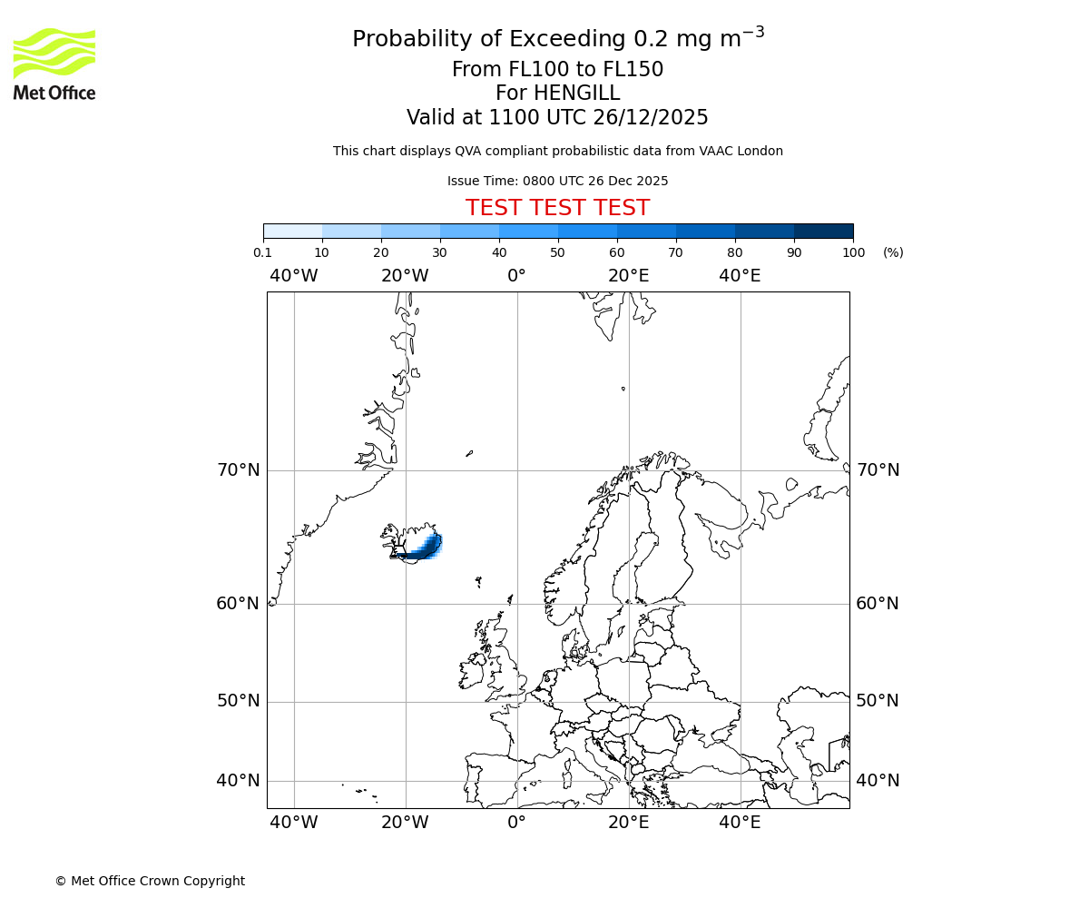 Probability of exceeding 0.2 milligrams per metre cubed. From 100 to 150 for HENGILL. Valid at 0800 UTC 26/12/2025