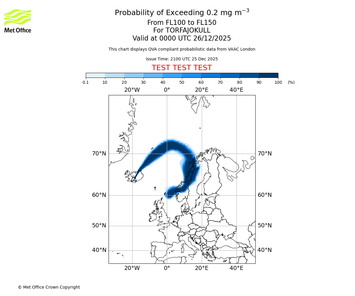 Probability of exceeding 0.2 milligrams per metre cubed. From 100 to 150 for TORFAJOKULL. Valid at 2100 UTC 25/12/2025