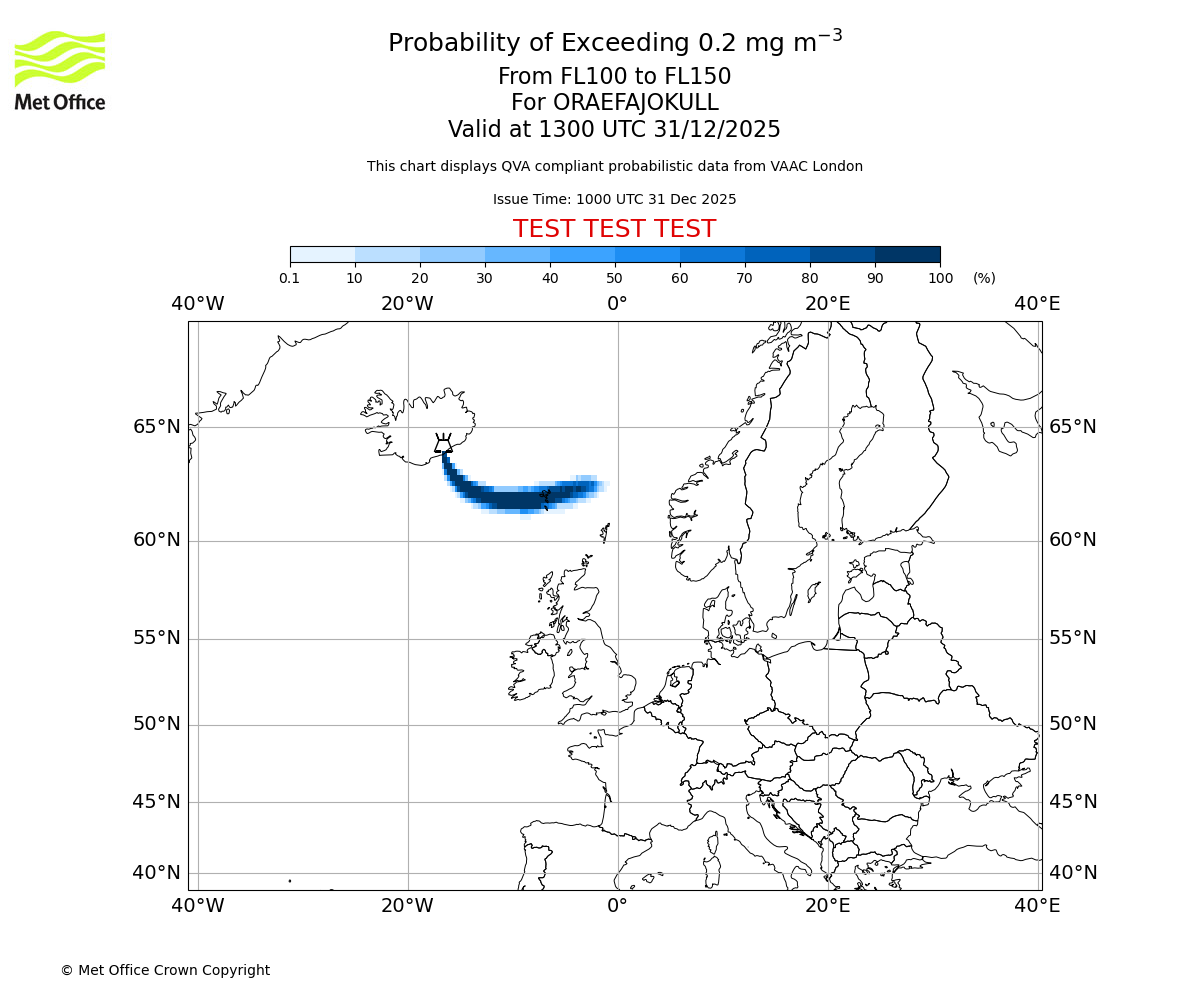 Probability of exceeding 0.2 milligrams per metre cubed. From 100 to 150 for ORAEFAJOKULL. Valid at 1000 UTC 31/12/2025