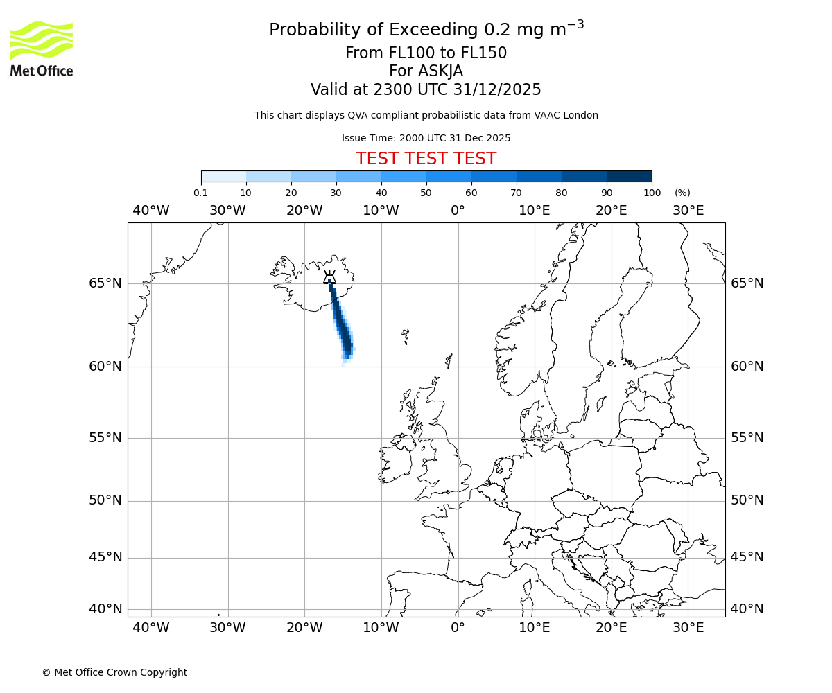 Probability of exceeding 0.2 milligrams per metre cubed. From 100 to 150 for ASKJA. Valid at 2000 UTC 31/12/2025