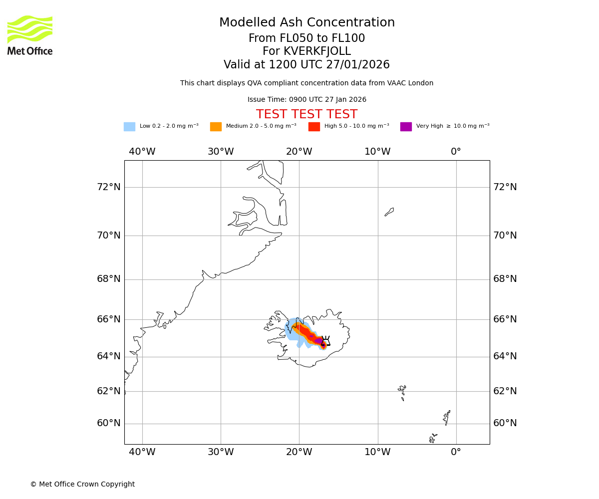 Modelled ash concentration from 000 to 050 for KVERKFJOLL. Valid at 1200 UTC 27/01/2026