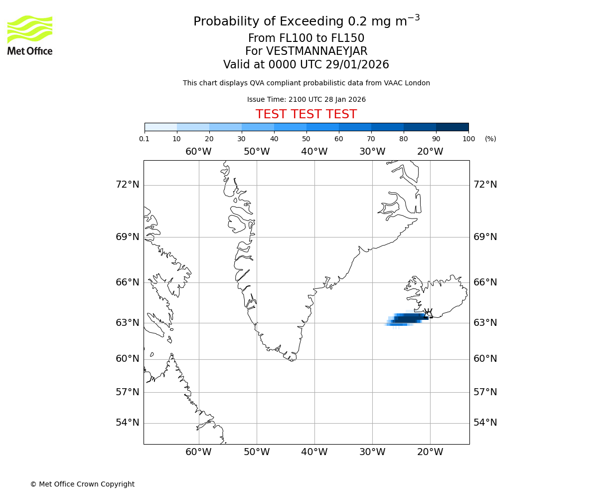 Probability of exceeding 0.2 milligrams per metre cubed. From 100 to 150 for VESTMANNAEYJAR. Valid at 2100 UTC 28/01/2026