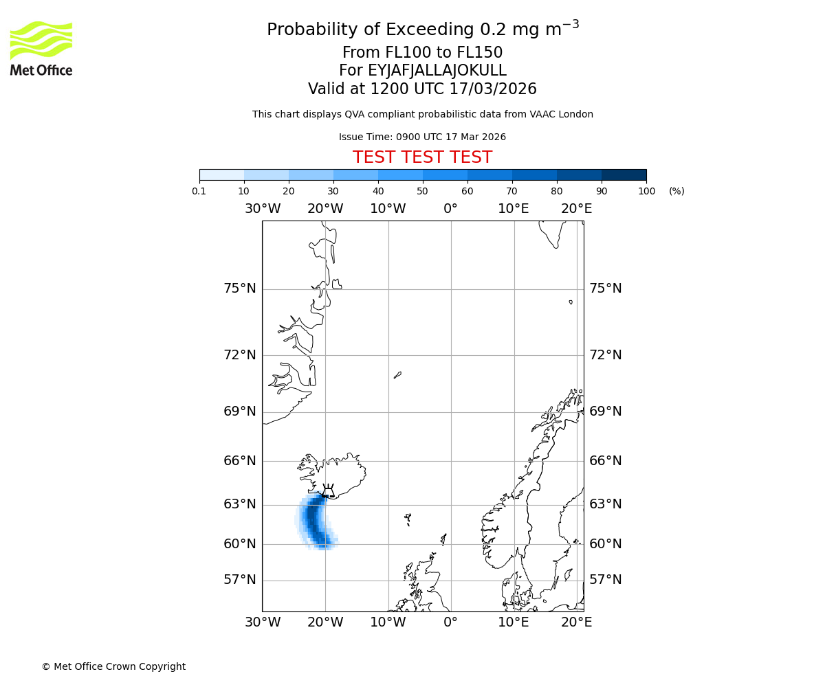Probability of exceeding 0.2 milligrams per metre cubed. From 100 to 150 for EYJAFJALLAJOKULL. Valid at 0900 UTC 17/03/2026