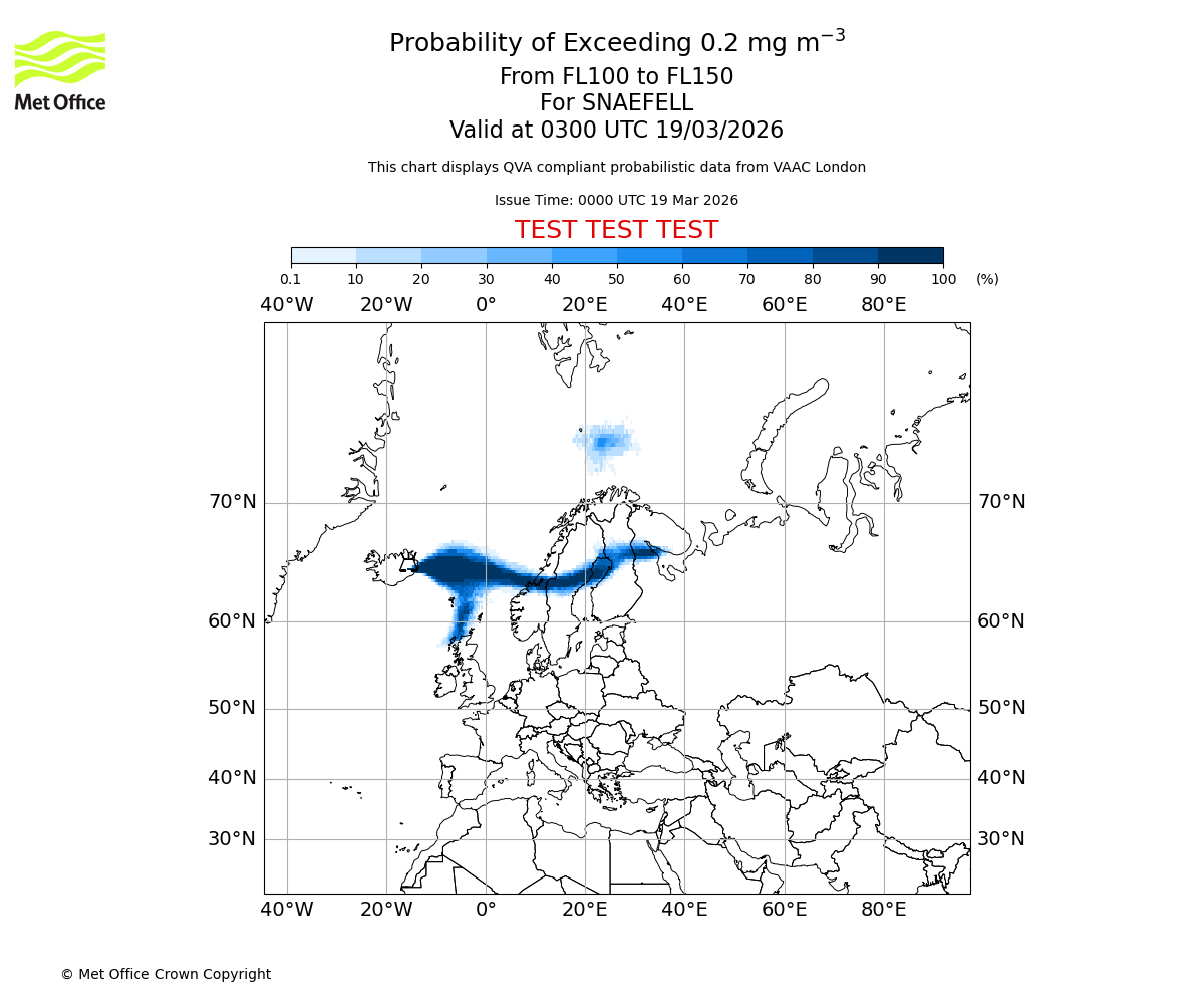 Quantitative Volcanic Ash charts (QVA) are produced in accordance with International Civil Aviation Organization (ICAO) Annex 3 requirements and are provided as well as the London Volcanic Ash Advisory Graphics (VAG) and Advisories (VAA). The lowest QVA threshold (0.2 mg/m³) matches to the areas depicted in the VAA and VAG. Both expected ash concentration and probabilistic forecast information is provided in the chart viewer below for eruptions occurring in the London Volcanic Ash Advisory Centre (VAAC) area of responsibility.