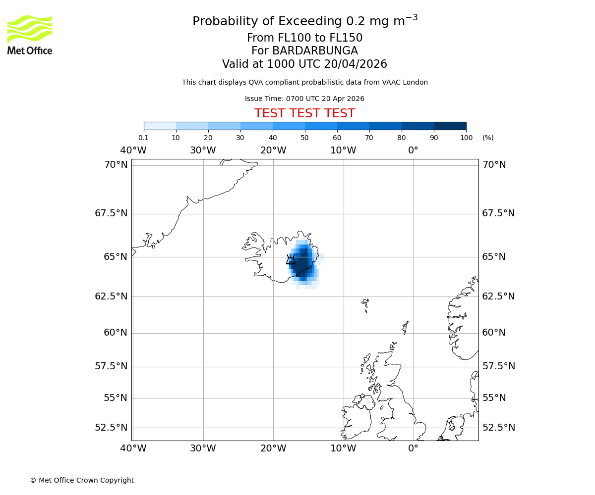 Probability of exceeding 0.2 milligrams per metre cubed. From 100 to 150 for BARDARBUNGA. Valid at 0700 UTC 20/04/2026