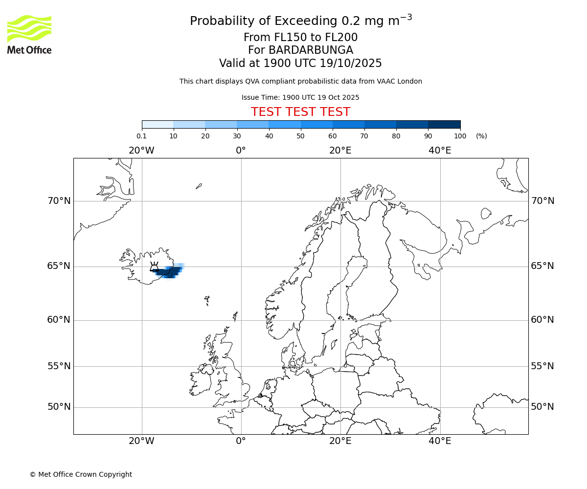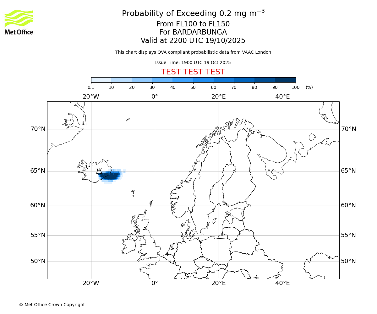 Probability of exceeding 0.2 milligrams per metre cubed. From 100 to 150 for BARDARBUNGA. Valid at 1900 UTC 19/10/2025