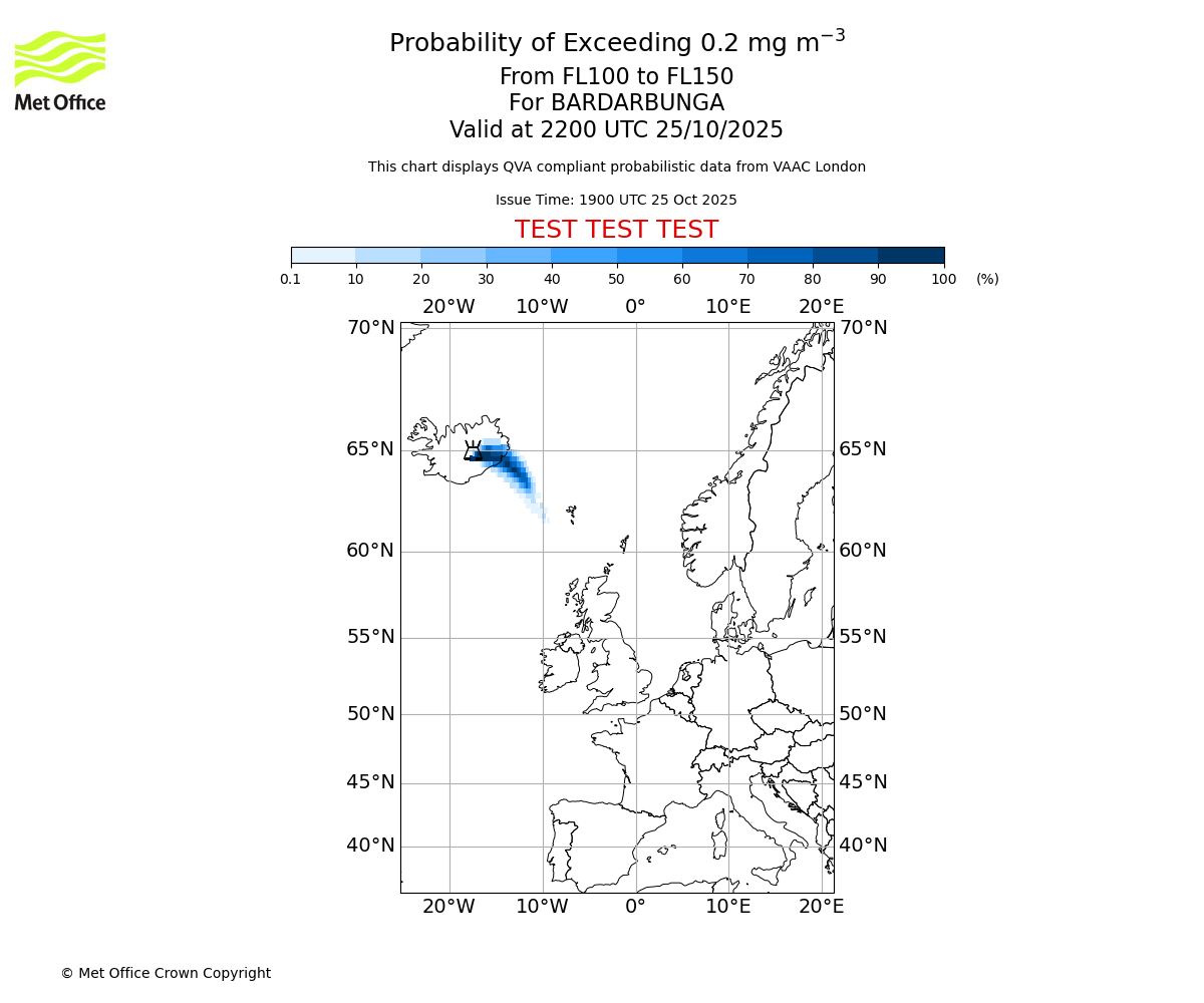 Probability of exceeding 0.2 milligrams per metre cubed. From 100 to 150 for BARDARBUNGA. Valid at 1900 UTC 25/10/2025