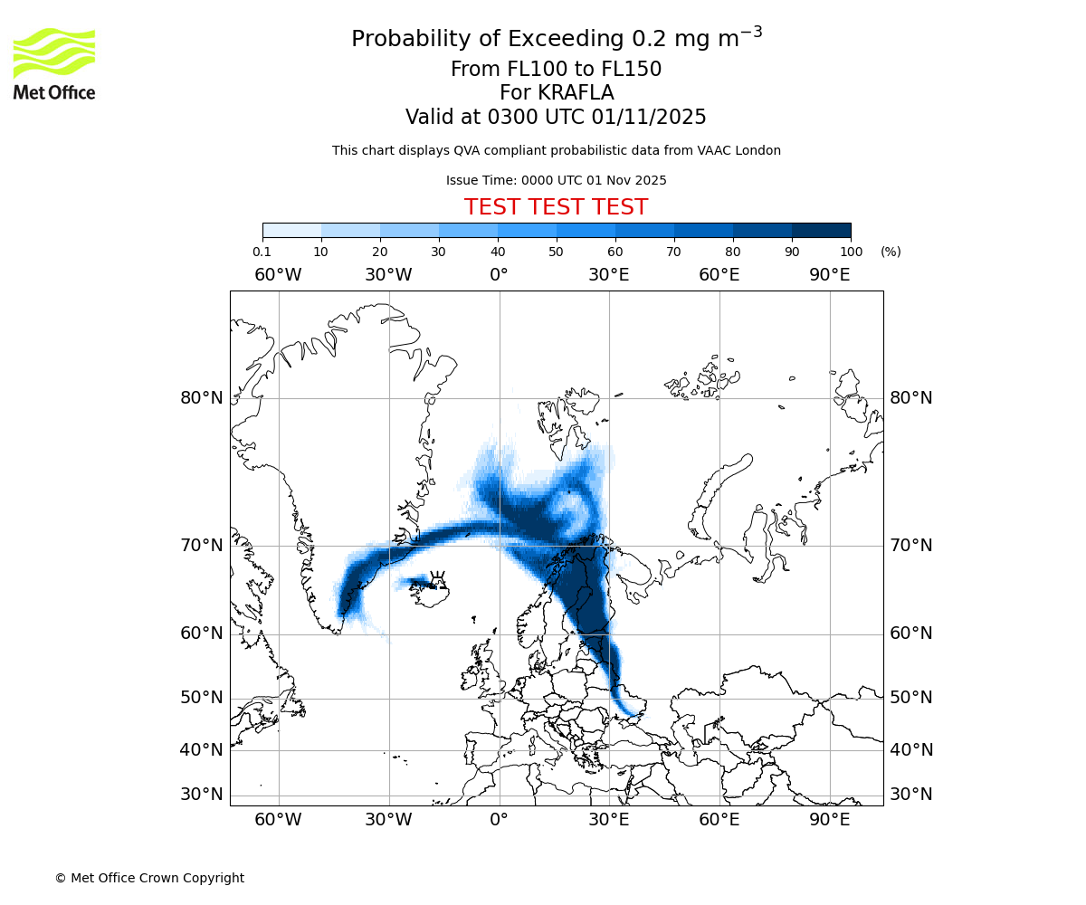 In accordance with ICAO Annex 3, Amendment 82 VAAC London will provide operational QVA forecasts from 27 November 2025 and these will be made available via a VAAC London QVA API information service. These charts are currently provided for test and evaluation purposes (not for operational use) until the introduction of the operational service.