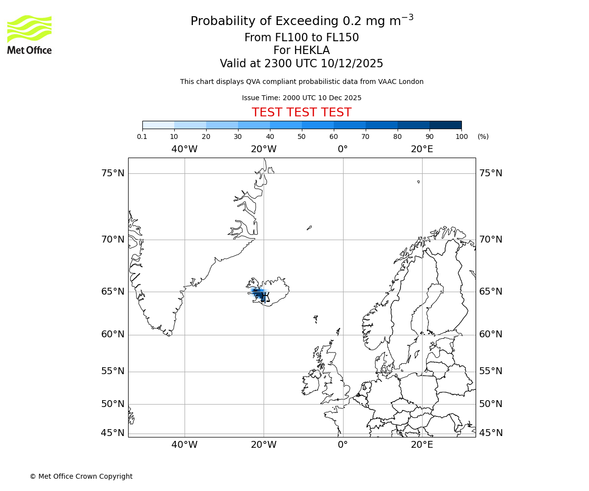 Probability of exceeding 0.2 milligrams per metre cubed. From 100 to 150 for HEKLA. Valid at 2000 UTC 10/12/2025