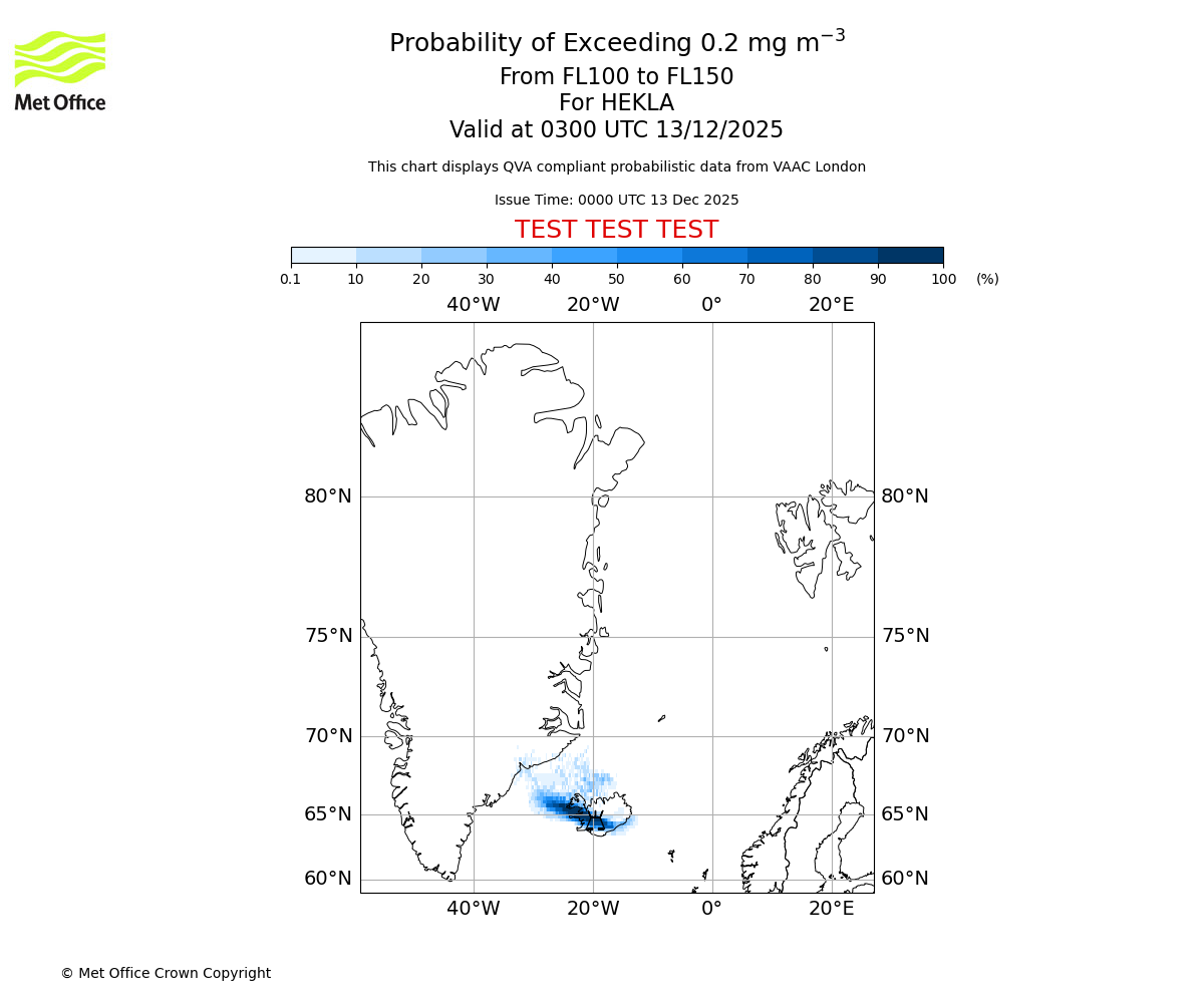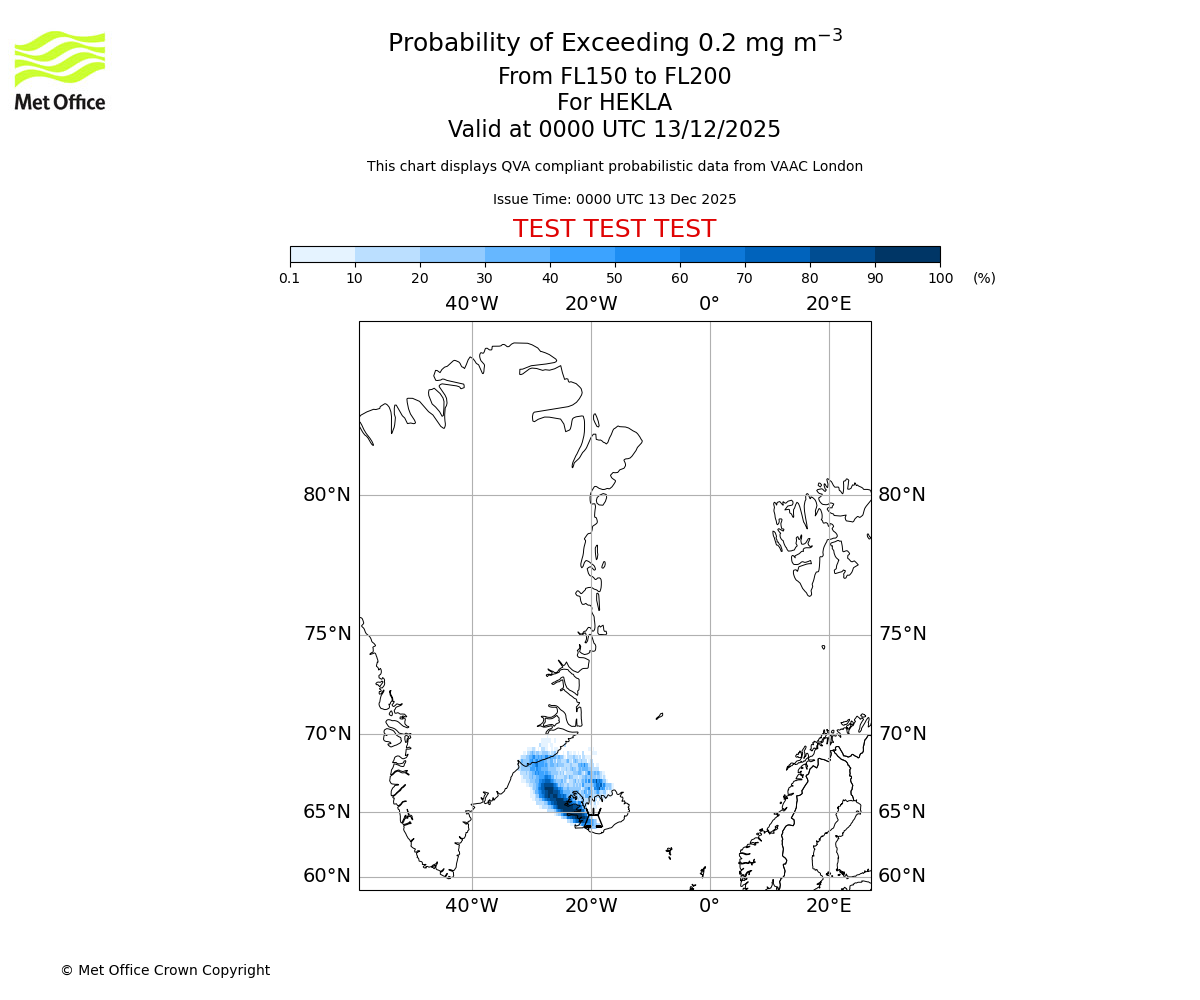 Probability of exceeding 0.2 milligrams per metre cubed. From 100 to 150 for HEKLA. Valid at 0000 UTC 13/12/2025