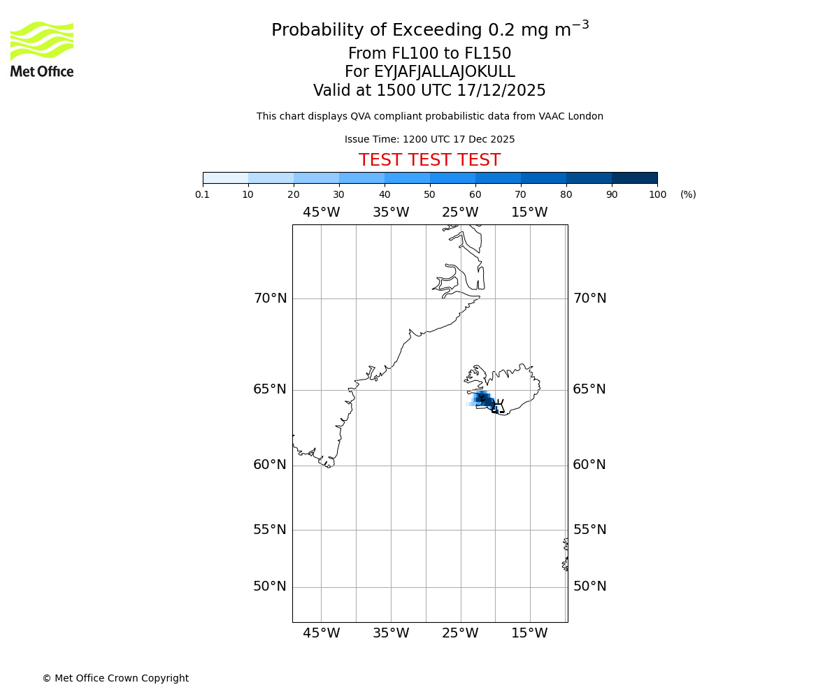Probability of exceeding 0.2 milligrams per metre cubed. From 100 to 150 for EYJAFJALLAJOKULL. Valid at 1200 UTC 17/12/2025