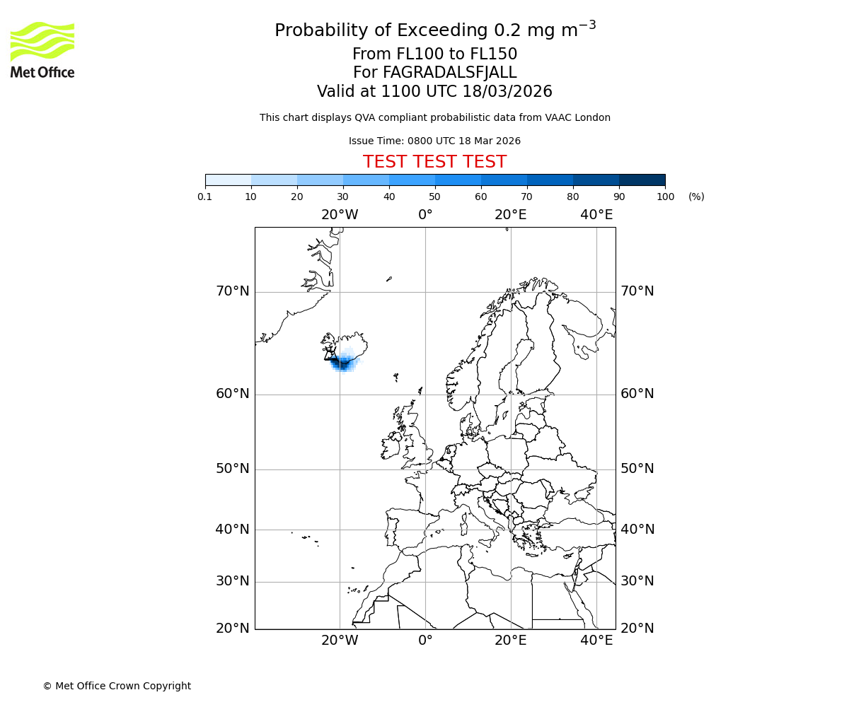 Probability of exceeding 0.2 milligrams per metre cubed. From 100 to 150 for FAGRADALSFJALL. Valid at 0800 UTC 18/03/2026