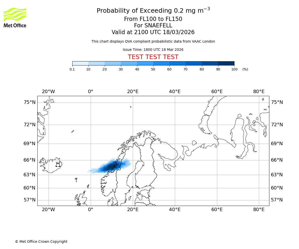 Quantitative Volcanic Ash charts (QVA) are produced in accordance with International Civil Aviation Organization (ICAO) Annex 3 requirements and are provided as well as the London Volcanic Ash Advisory Graphics (VAG) and Advisories (VAA). The lowest QVA threshold (0.2 mg/m³) matches to the areas depicted in the VAA and VAG. Both expected ash concentration and probabilistic forecast information is provided in the chart viewer below for eruptions occurring in the London Volcanic Ash Advisory Centre (VAAC) area of responsibility.
