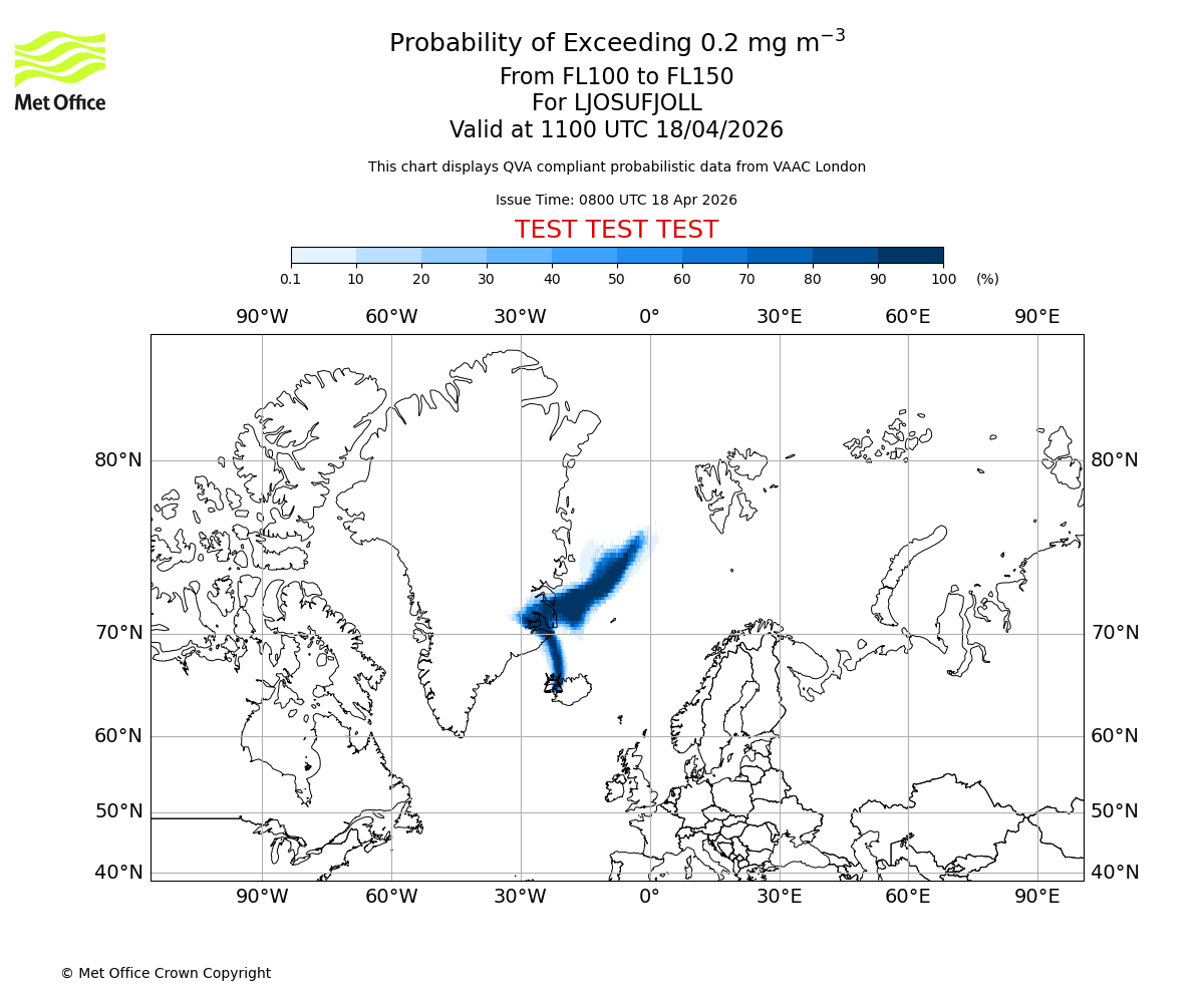 Modelled ash concentration from 000 to 200 for LJOSUFJOLL. Valid at 0800 UTC 18/04/2026