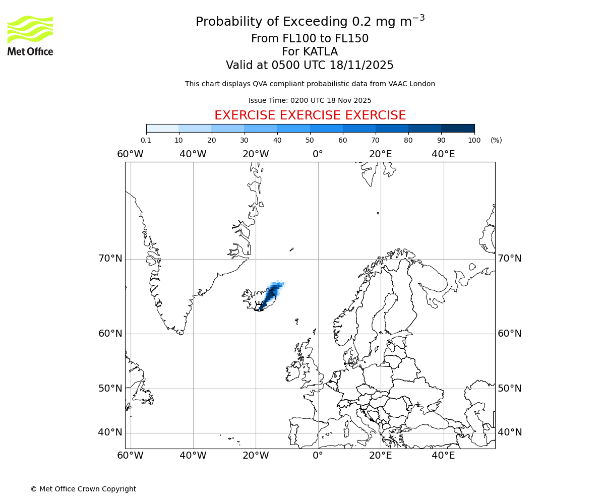 Probability of exceeding 0.2 milligrams per metre cubed. From 100 to 150 for KATLA. Valid at 0200 UTC 18/11/2025