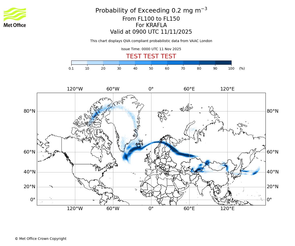 In accordance with ICAO Annex 3, Amendment 82 VAAC London will provide operational QVA forecasts from 27 November 2025 and these will be made available via a VAAC London QVA API information service. These charts are currently provided for test and evaluation purposes (not for operational use) until the introduction of the operational service.