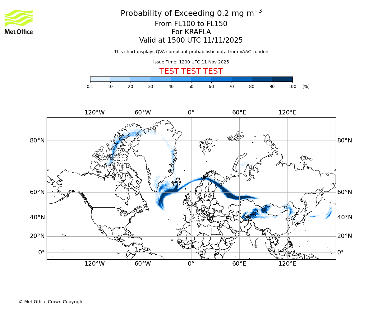 In accordance with ICAO Annex 3, Amendment 82 VAAC London will provide operational QVA forecasts from 27 November 2025 and these will be made available via a VAAC London QVA API information service. These charts are currently provided for test and evaluation purposes (not for operational use) until the introduction of the operational service.