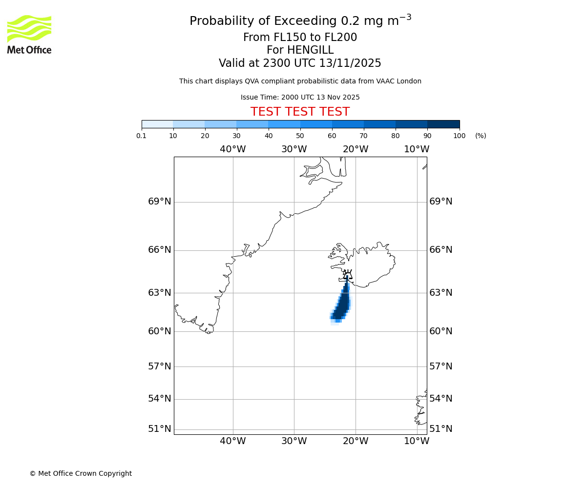 Probability of exceeding 0.2 milligrams per metre cubed. From 100 to 150 for HENGILL. Valid at 2300 UTC 13/11/2025