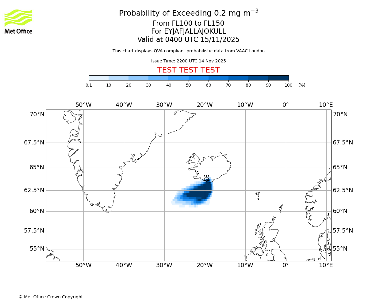 In accordance with ICAO Annex 3, Amendment 82 VAAC London will provide operational QVA forecasts from 27 November 2025 and these will be made available via a VAAC London QVA API information service. These charts are currently provided for test and evaluation purposes (not for operational use) until the introduction of the operational service.