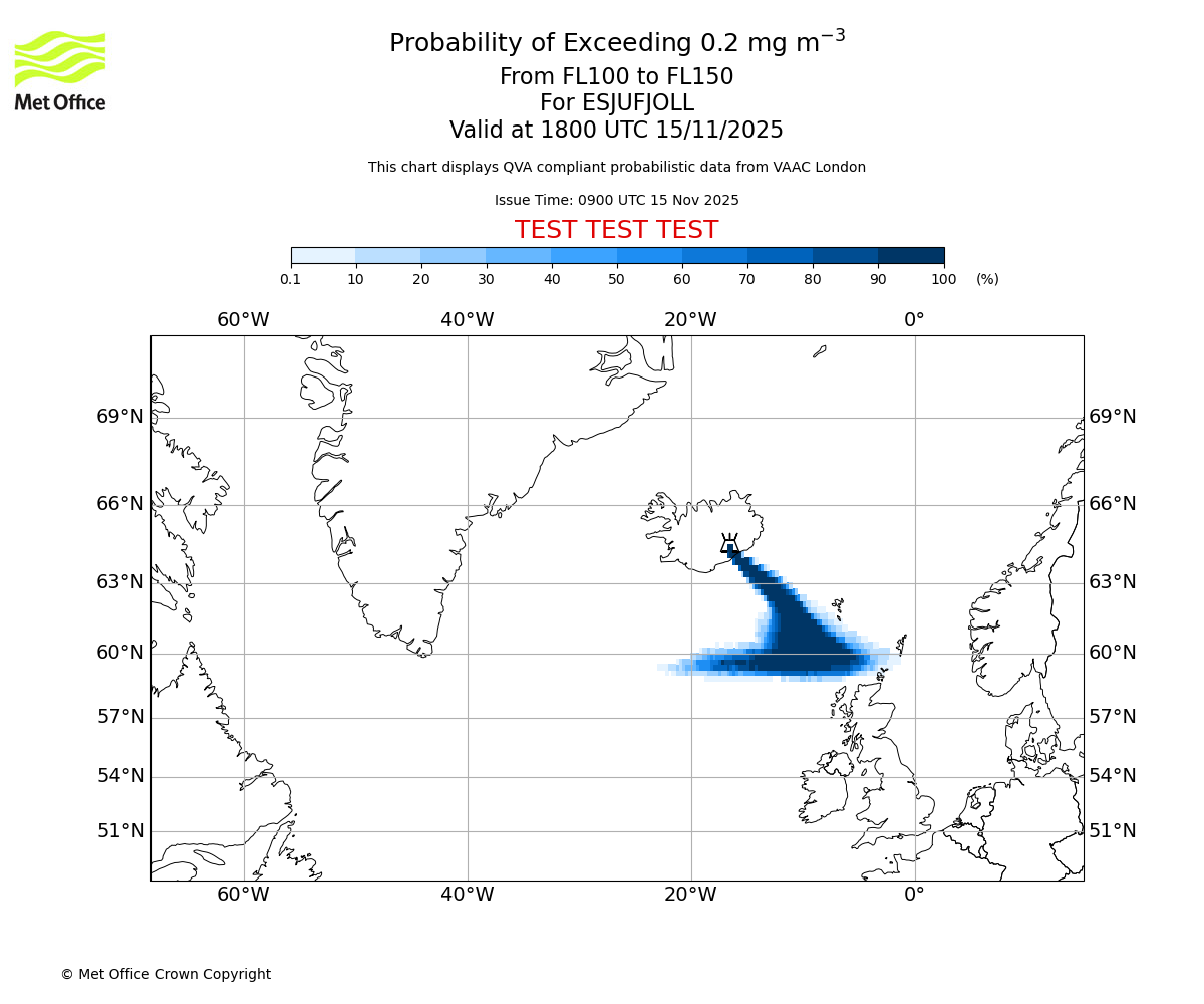In accordance with ICAO Annex 3, Amendment 82 VAAC London will provide operational QVA forecasts from 27 November 2025 and these will be made available via a VAAC London QVA API information service. These charts are currently provided for test and evaluation purposes (not for operational use) until the introduction of the operational service.