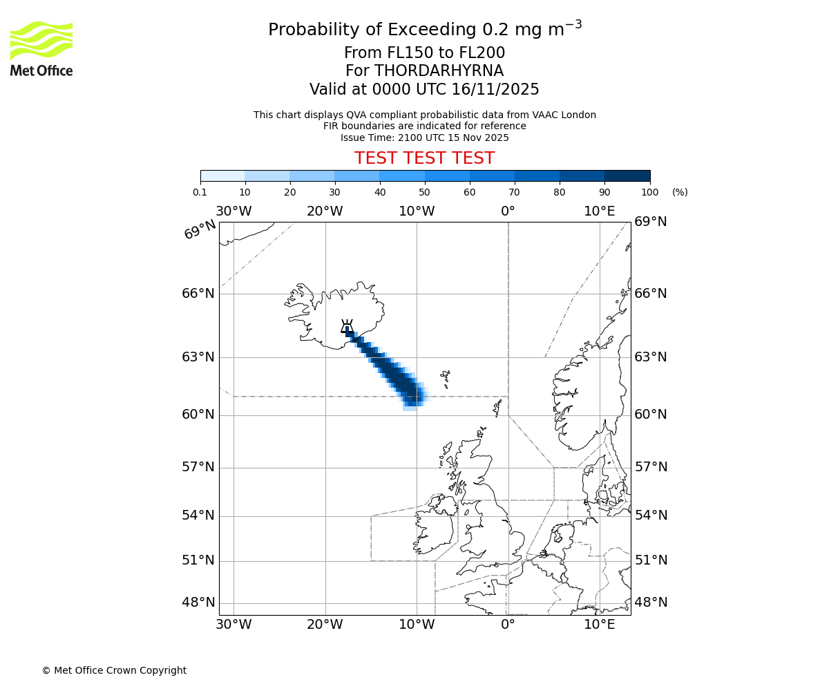 Probability of exceeding 0.2 milligrams per metre cubed. From 100 to 150 for THORDARHYRNA. Valid at 0000 UTC 16/11/2025