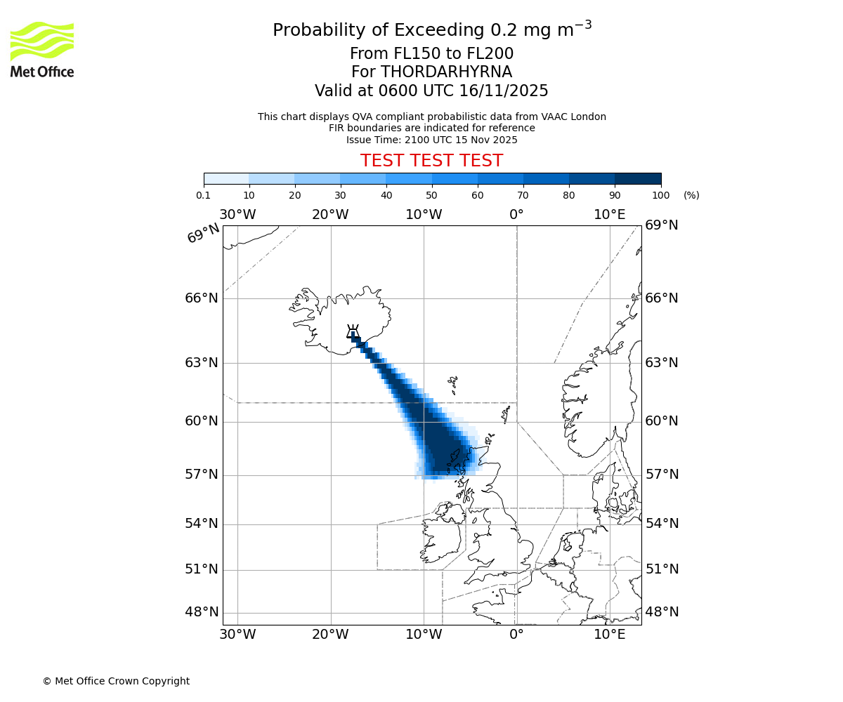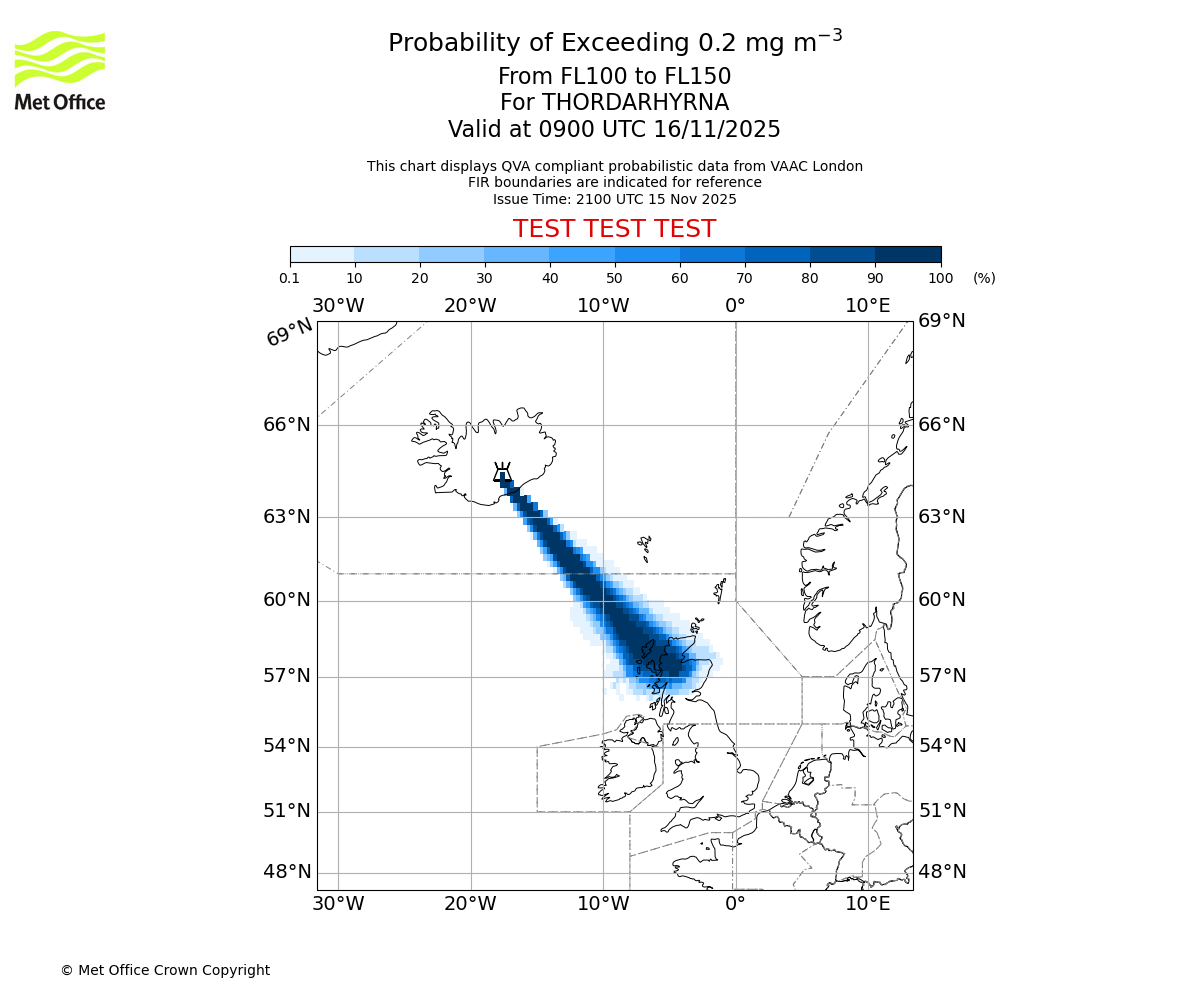 Probability of exceeding 0.2 milligrams per metre cubed. From 100 to 150 for THORDARHYRNA. Valid at 0600 UTC 16/11/2025