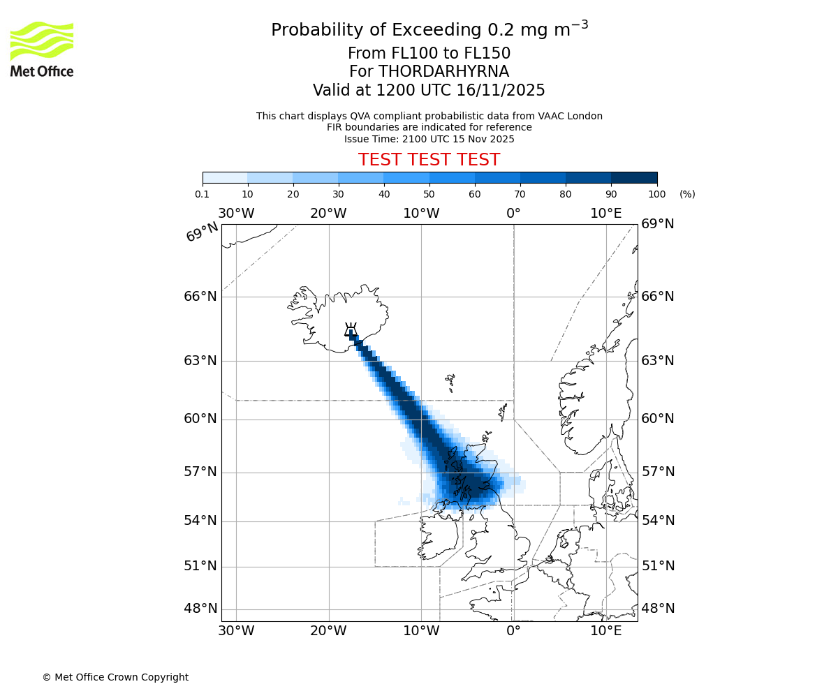 Probability of exceeding 0.2 milligrams per metre cubed. From 100 to 150 for THORDARHYRNA. Valid at 0900 UTC 16/11/2025