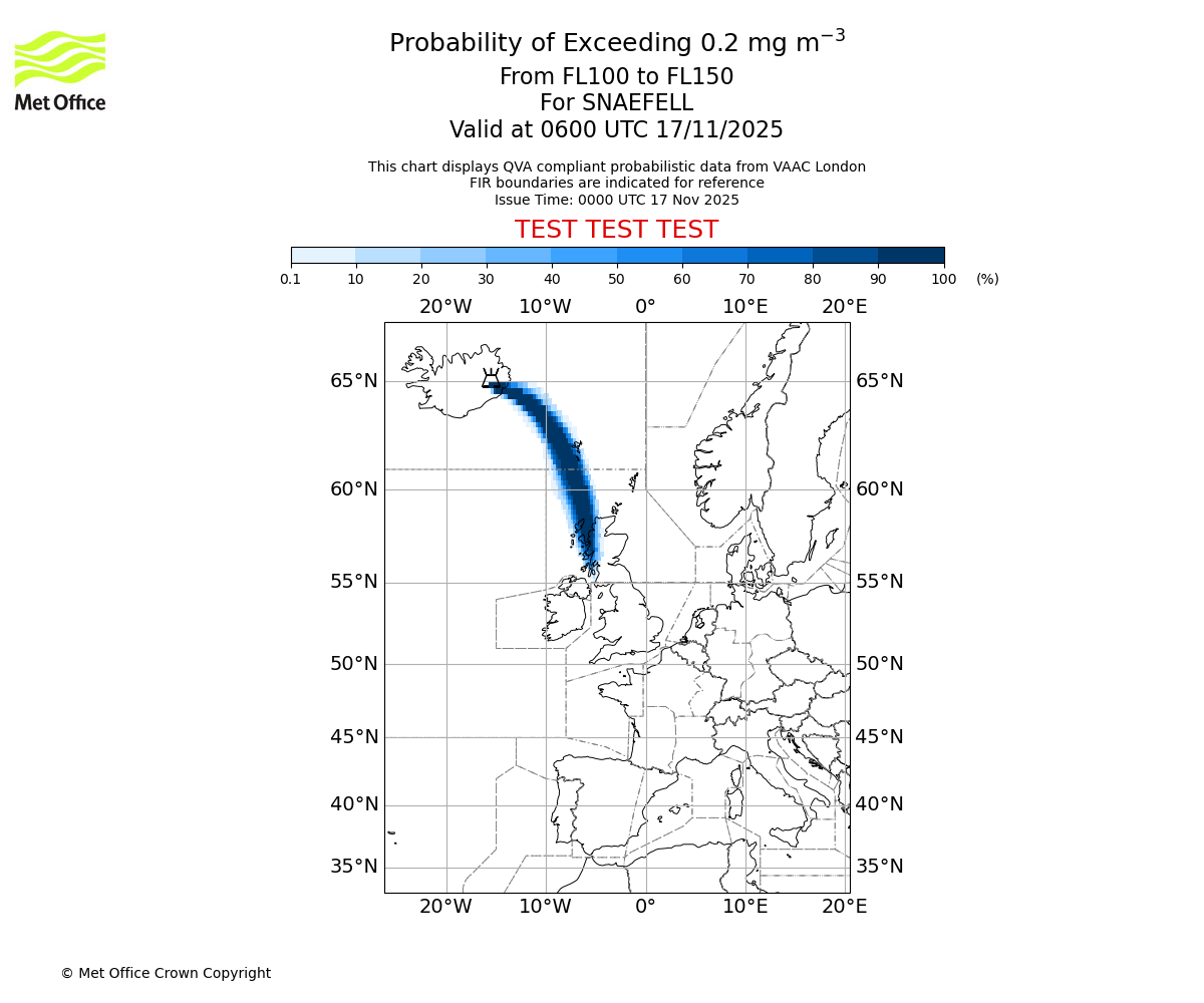 In accordance with ICAO Annex 3, Amendment 82 VAAC London will provide operational QVA forecasts from 27 November 2025 and these will be made available via a VAAC London QVA API information service. These charts are currently provided for test and evaluation purposes (not for operational use) until the introduction of the operational service.