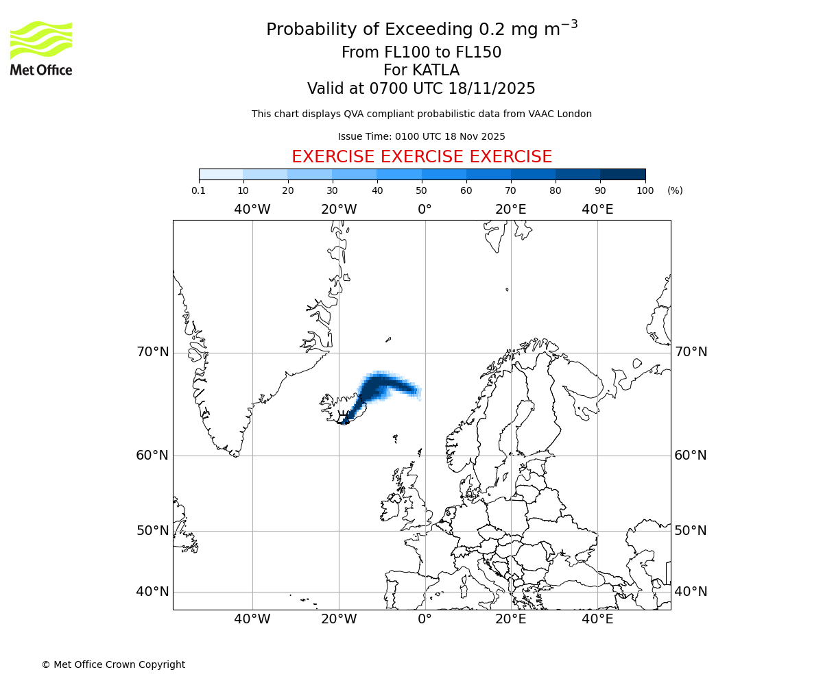 Probability of exceeding 0.2 milligrams per metre cubed. From 100 to 150 for KATLA. Valid at 0400 UTC 18/11/2025