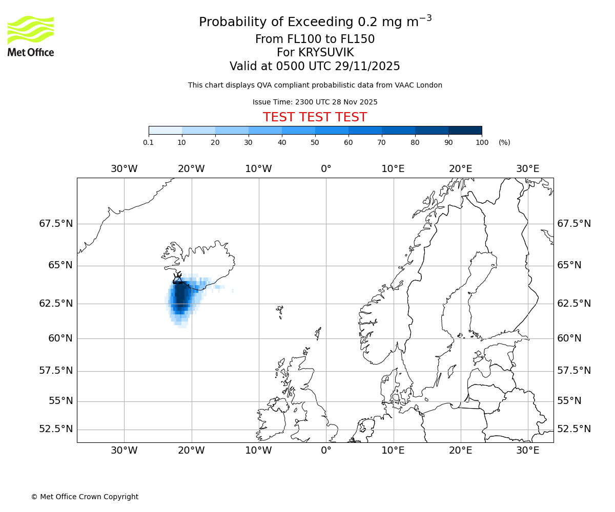 Modelled ash concentration from 000 to 200 for KRYSUVIK. Valid at 2300 UTC 28/11/2025