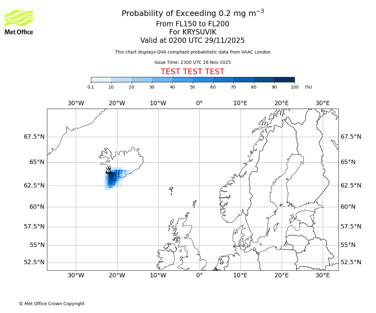 Quantitative Volcanic Ash charts (QVA) are produced in accordance with International Civil Aviation Organization (ICAO) Annex 3 requirements and are provided as well as the London Volcanic Ash Advisory Graphics (VAG) and Advisories (VAA). The lowest QVA threshold (0.2 mg/m³) matches to the areas depicted in the VAA and VAG. Both expected ash concentration and probabilistic forecast information is provided in the chart viewer below for eruptions occurring in the London Volcanic Ash Advisory Centre (VAAC) area of responsibility.