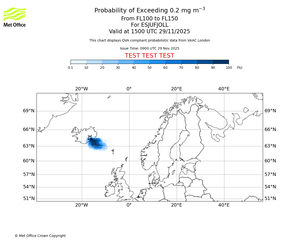 Quantitative Volcanic Ash charts (QVA) are produced in accordance with International Civil Aviation Organization (ICAO) Annex 3 requirements and are provided as well as the London Volcanic Ash Advisory Graphics (VAG) and Advisories (VAA). The lowest QVA threshold (0.2 mg/m³) matches to the areas depicted in the VAA and VAG. Both expected ash concentration and probabilistic forecast information is provided in the chart viewer below for eruptions occurring in the London Volcanic Ash Advisory Centre (VAAC) area of responsibility.