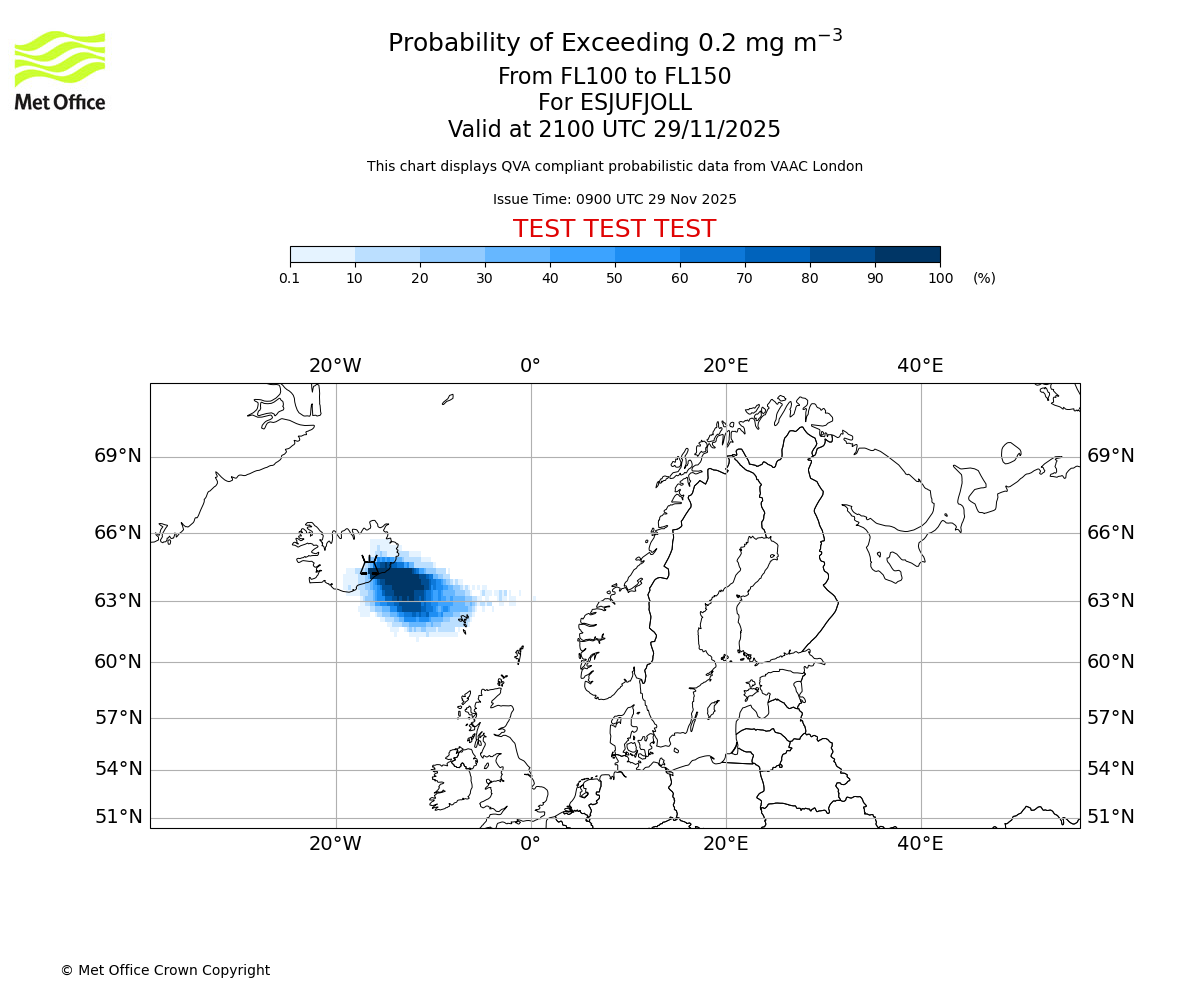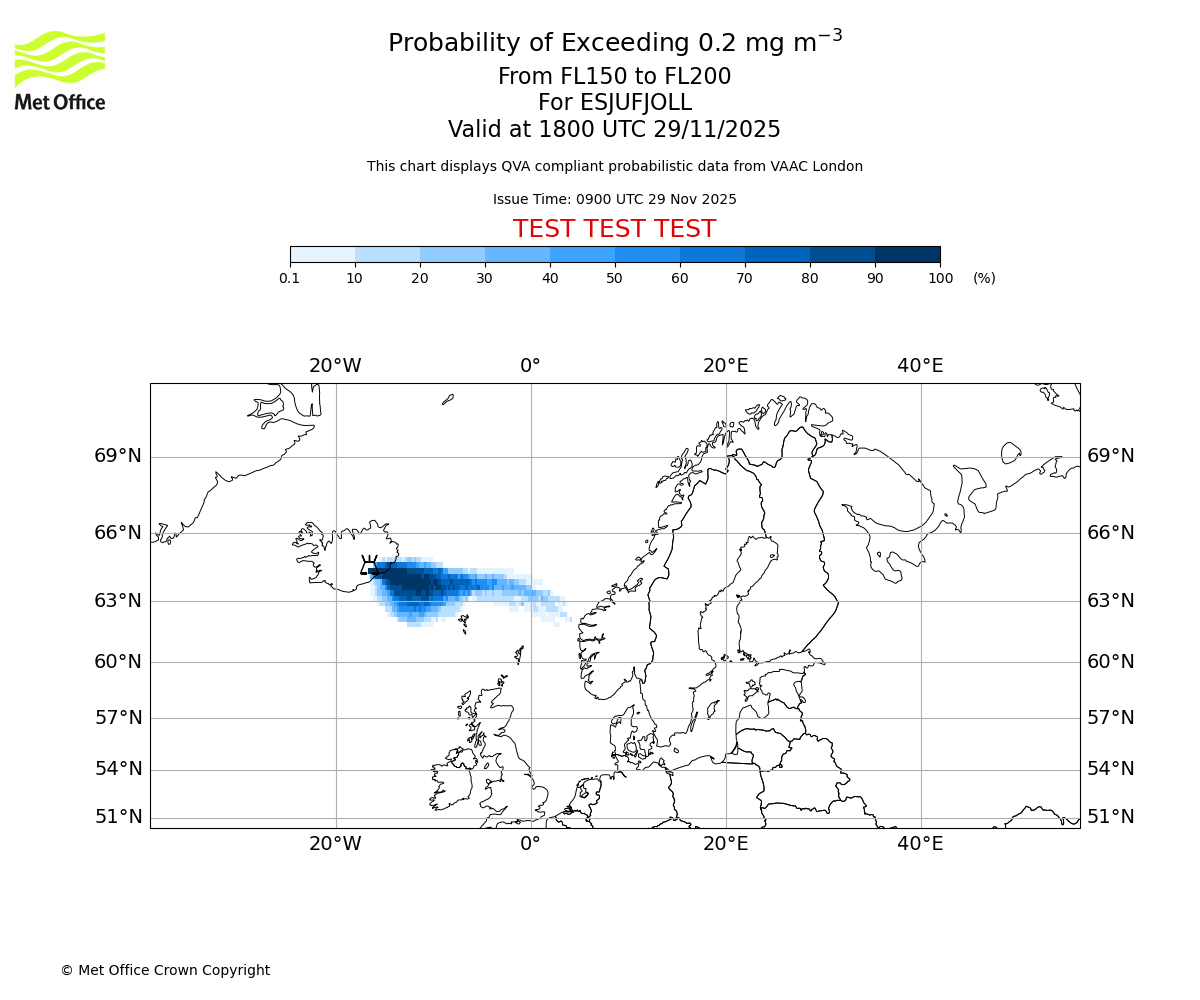 Quantitative Volcanic Ash charts (QVA) are produced in accordance with International Civil Aviation Organization (ICAO) Annex 3 requirements and are provided as well as the London Volcanic Ash Advisory Graphics (VAG) and Advisories (VAA). The lowest QVA threshold (0.2 mg/m³) matches to the areas depicted in the VAA and VAG. Both expected ash concentration and probabilistic forecast information is provided in the chart viewer below for eruptions occurring in the London Volcanic Ash Advisory Centre (VAAC) area of responsibility.