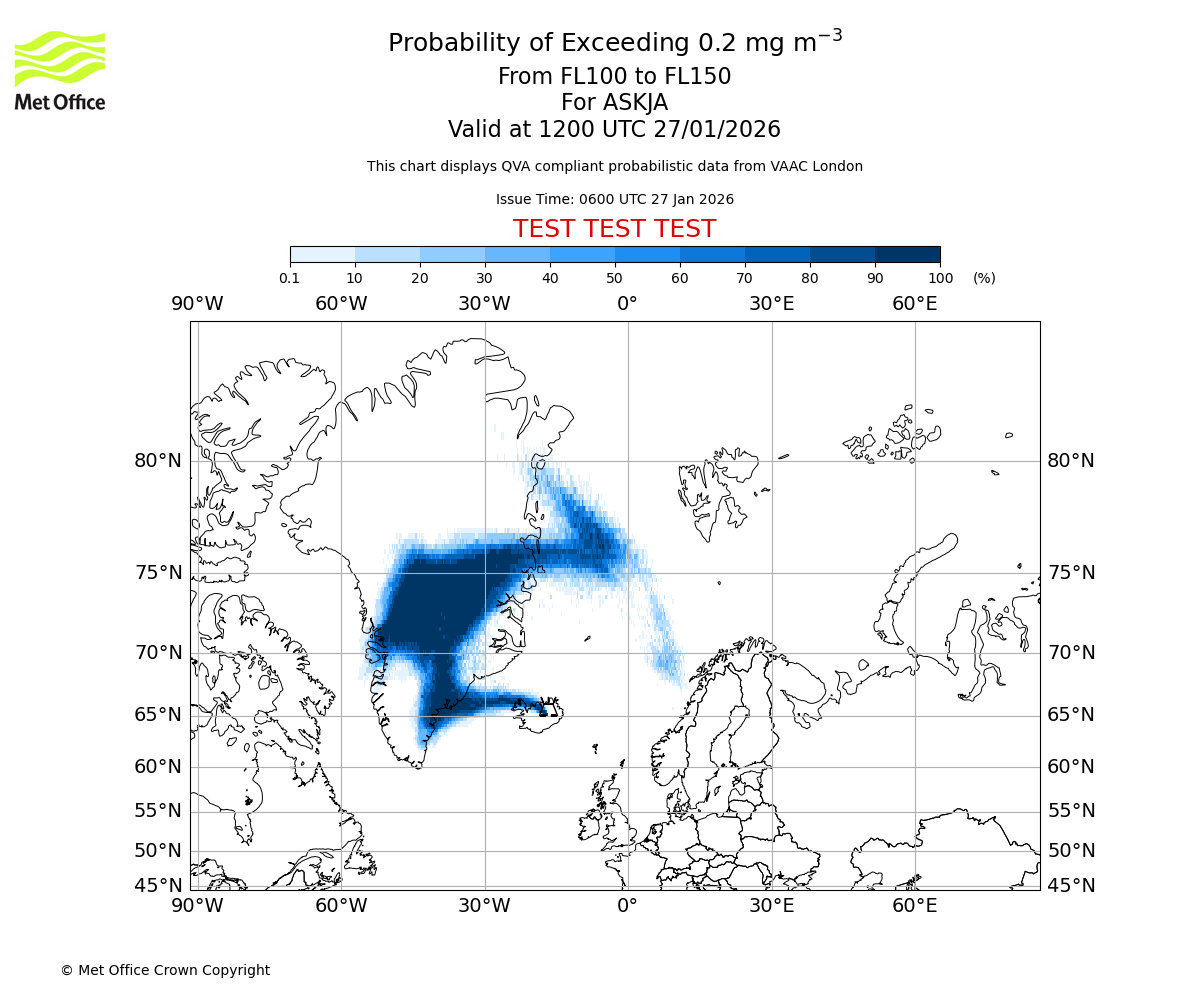 Probability of exceeding 0.2 milligrams per metre cubed. From 100 to 150 for ASKJA. Valid at 0900 UTC 27/01/2026