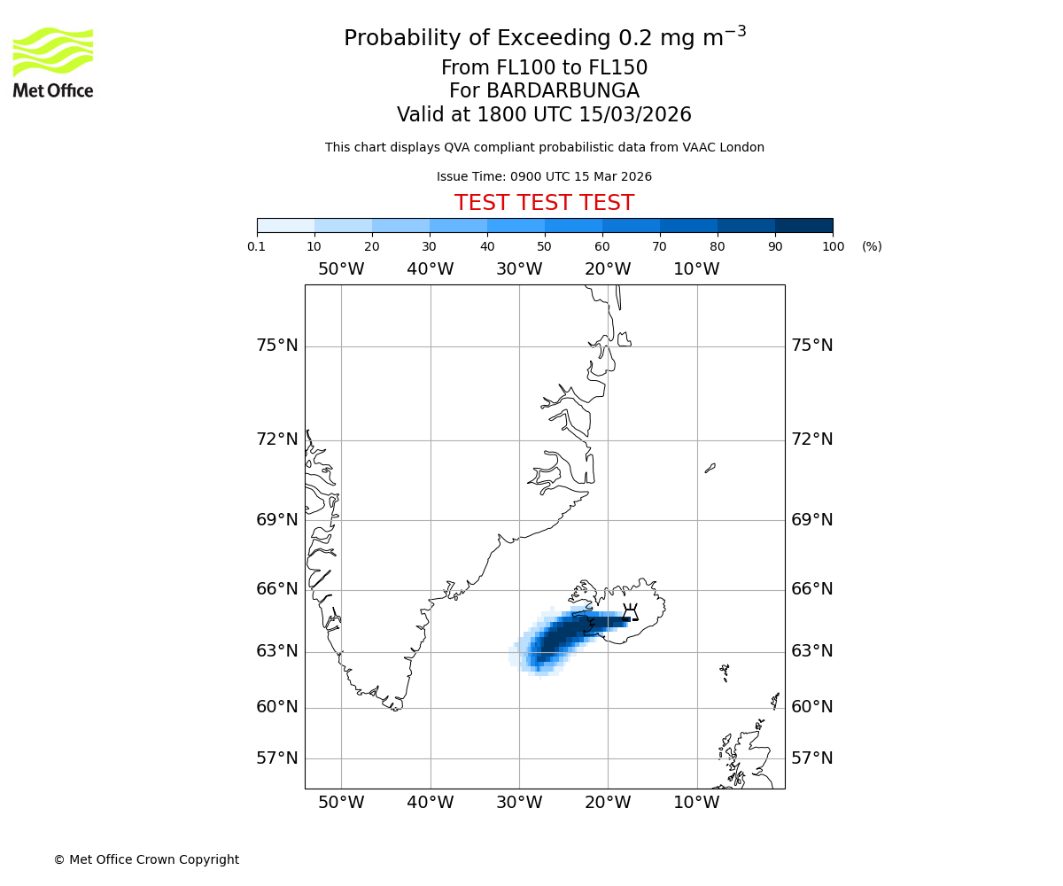 Modelled ash concentration from 000 to 200 for BARDARBUNGA. Valid at 0900 UTC 15/03/2026