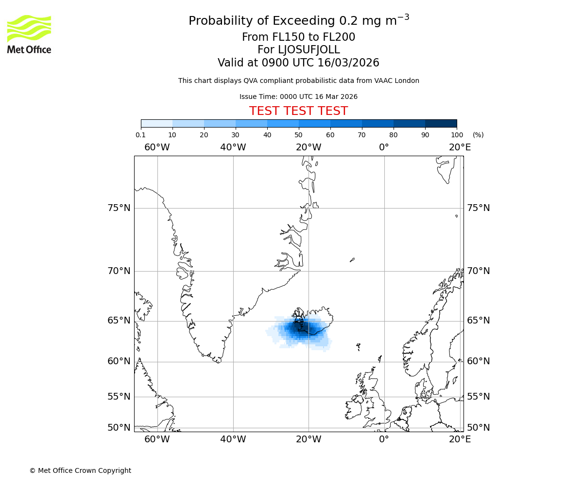 Modelled ash concentration from 000 to 200 for LJOSUFJOLL. Valid at 0000 UTC 16/03/2026
