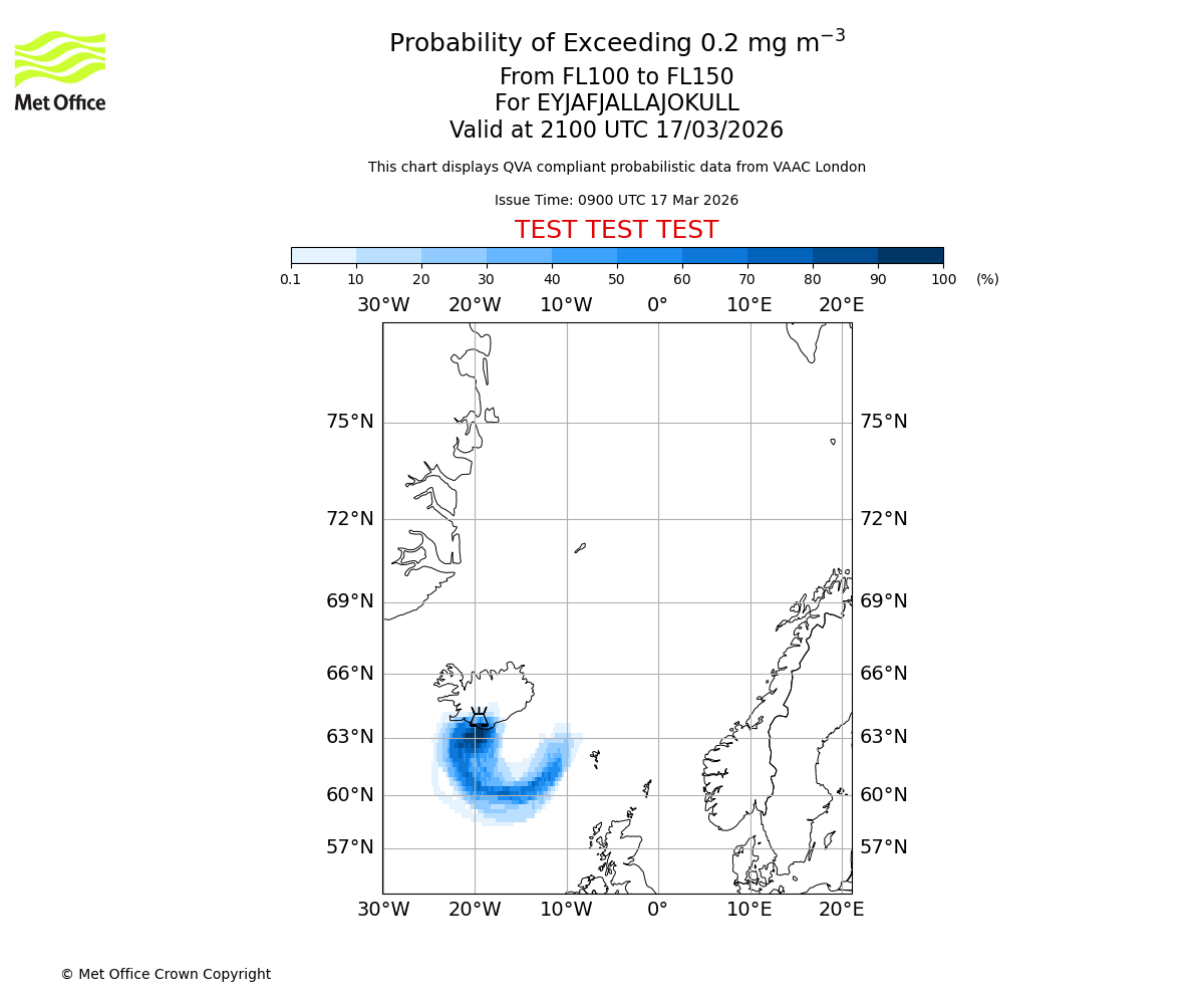 Probability of exceeding 0.2 milligrams per metre cubed. From 100 to 150 for EYJAFJALLAJOKULL. Valid at 1800 UTC 17/03/2026