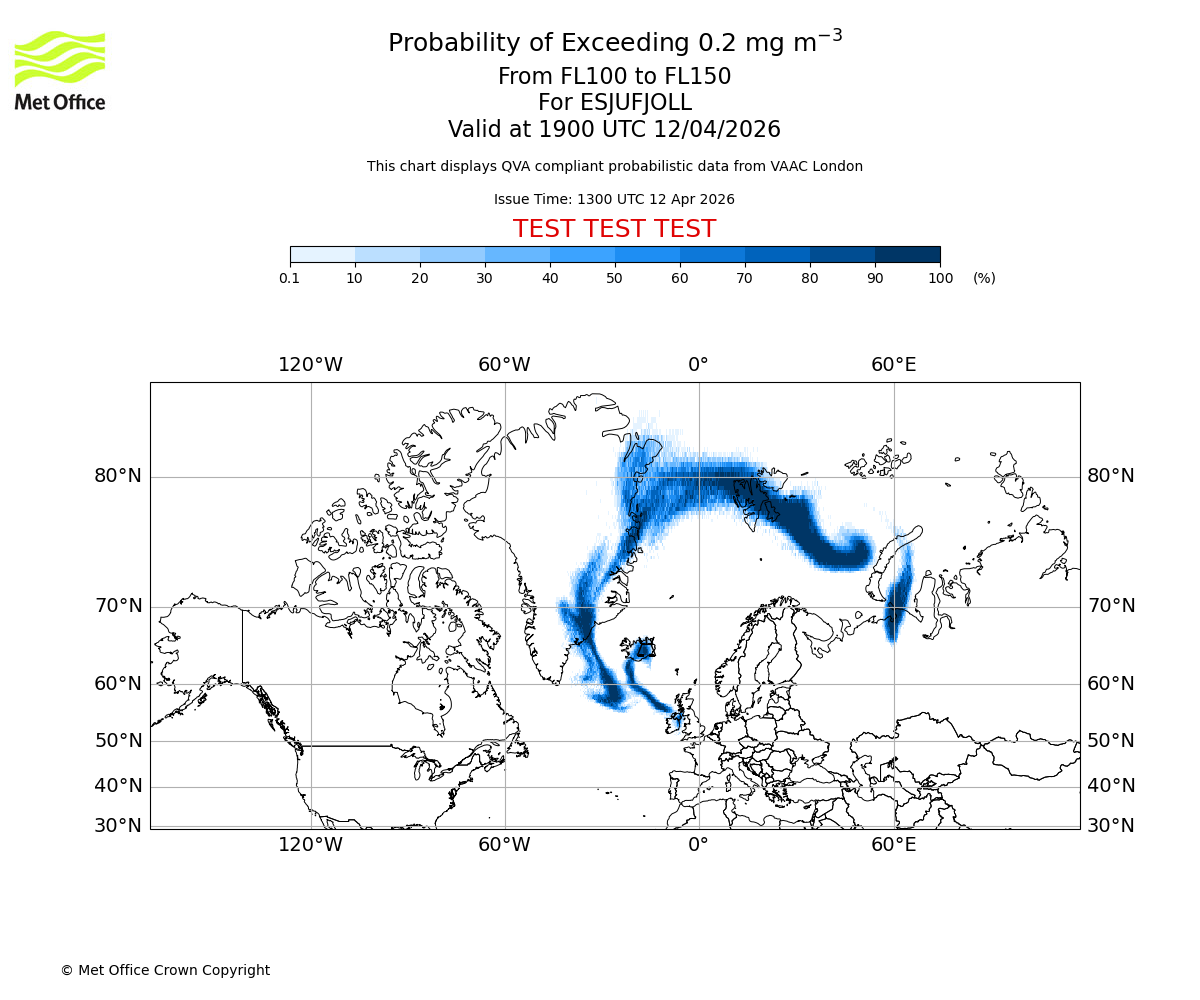 Quantitative Volcanic Ash charts (QVA) are produced in accordance with International Civil Aviation Organization (ICAO) Annex 3 requirements and are provided as well as the London Volcanic Ash Advisory Graphics (VAG) and Advisories (VAA). The lowest QVA threshold (0.2 mg/m³) matches to the areas depicted in the VAA and VAG. Both expected ash concentration and probabilistic forecast information is provided in the chart viewer below for eruptions occurring in the London Volcanic Ash Advisory Centre (VAAC) area of responsibility.