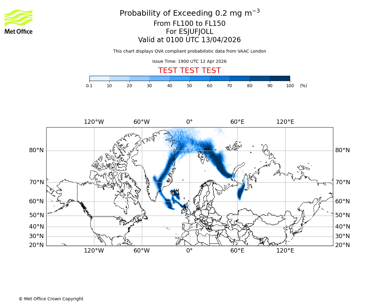 Quantitative Volcanic Ash charts (QVA) are produced in accordance with International Civil Aviation Organization (ICAO) Annex 3 requirements and are provided as well as the London Volcanic Ash Advisory Graphics (VAG) and Advisories (VAA). The lowest QVA threshold (0.2 mg/m³) matches to the areas depicted in the VAA and VAG. Both expected ash concentration and probabilistic forecast information is provided in the chart viewer below for eruptions occurring in the London Volcanic Ash Advisory Centre (VAAC) area of responsibility.