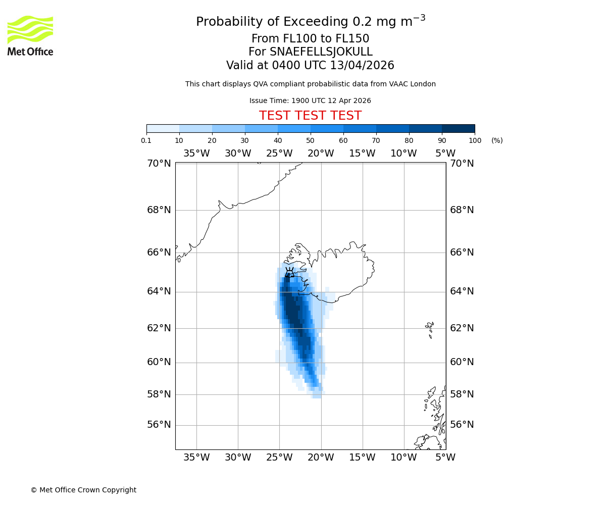 Modelled ash concentration from 000 to 200 for SNAEFELLSJOKULL. Valid at 1900 UTC 12/04/2026
