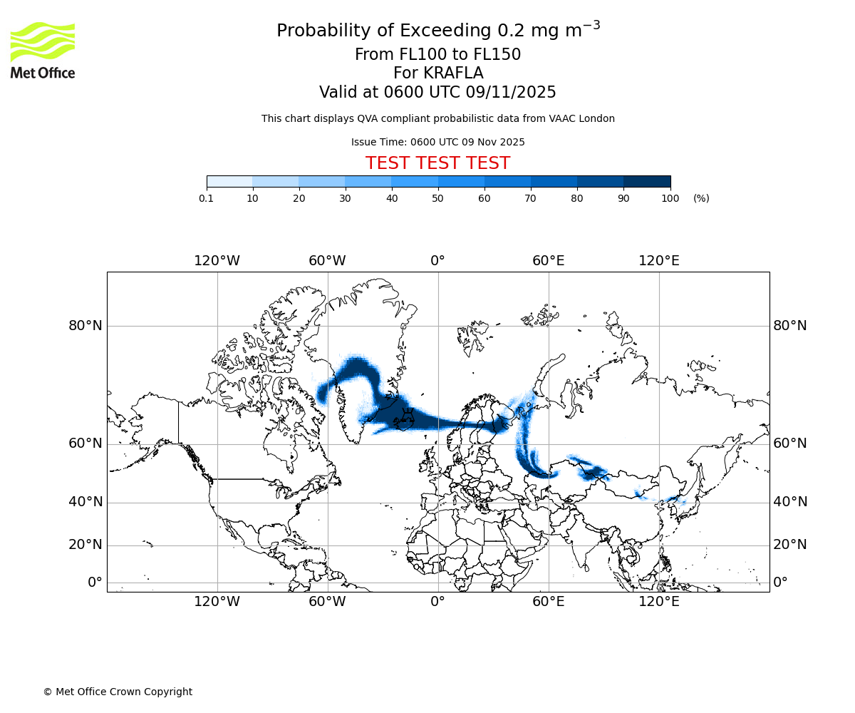 In accordance with ICAO Annex 3, Amendment 82 VAAC London will provide operational QVA forecasts from 27 November 2025 and these will be made available via a VAAC London QVA API information service. These charts are currently provided for test and evaluation purposes (not for operational use) until the introduction of the operational service.