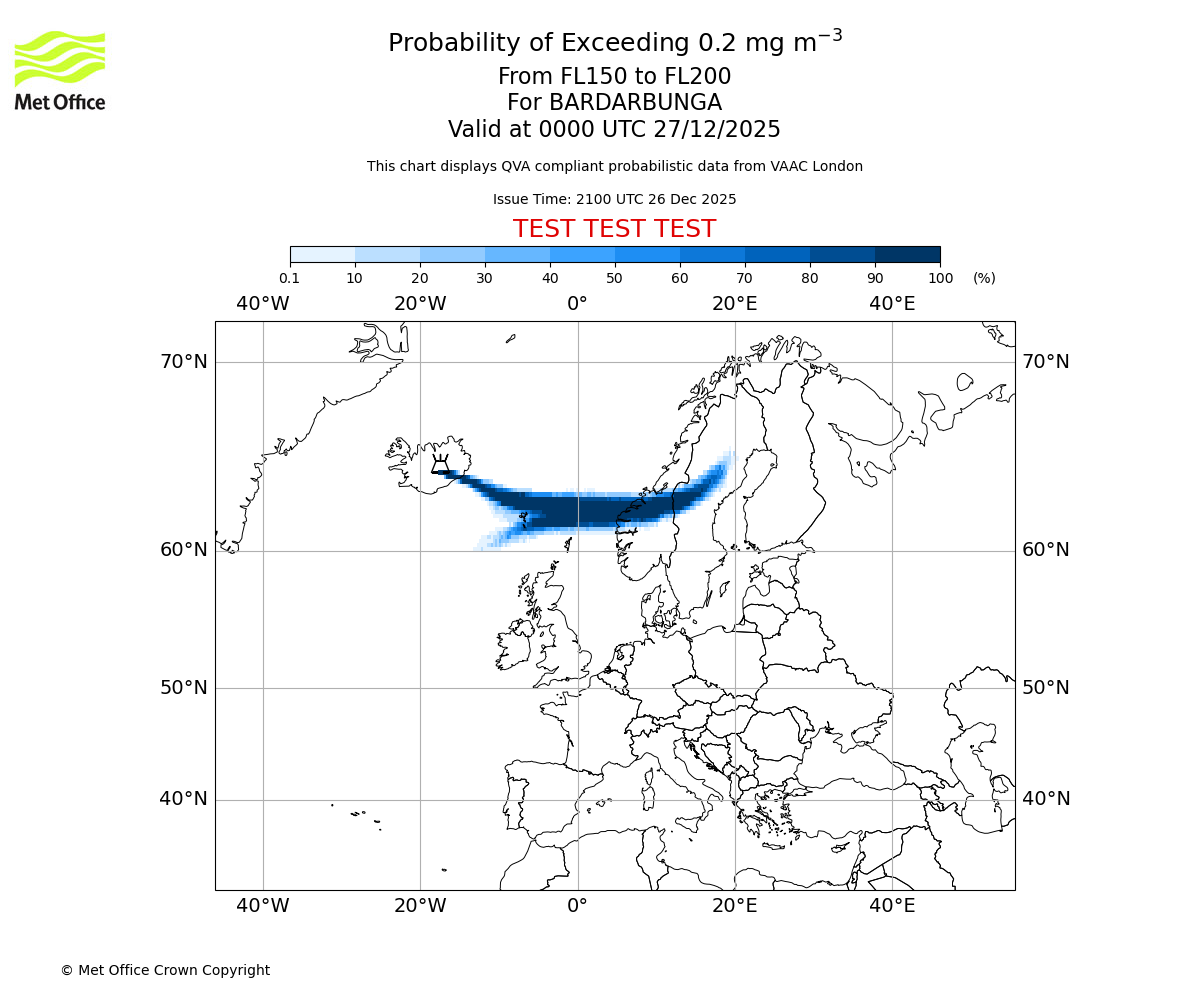 Probability of exceeding 0.2 milligrams per metre cubed. From 150 to 200 for BARDARBUNGA. Valid at 2100 UTC 26/12/2025