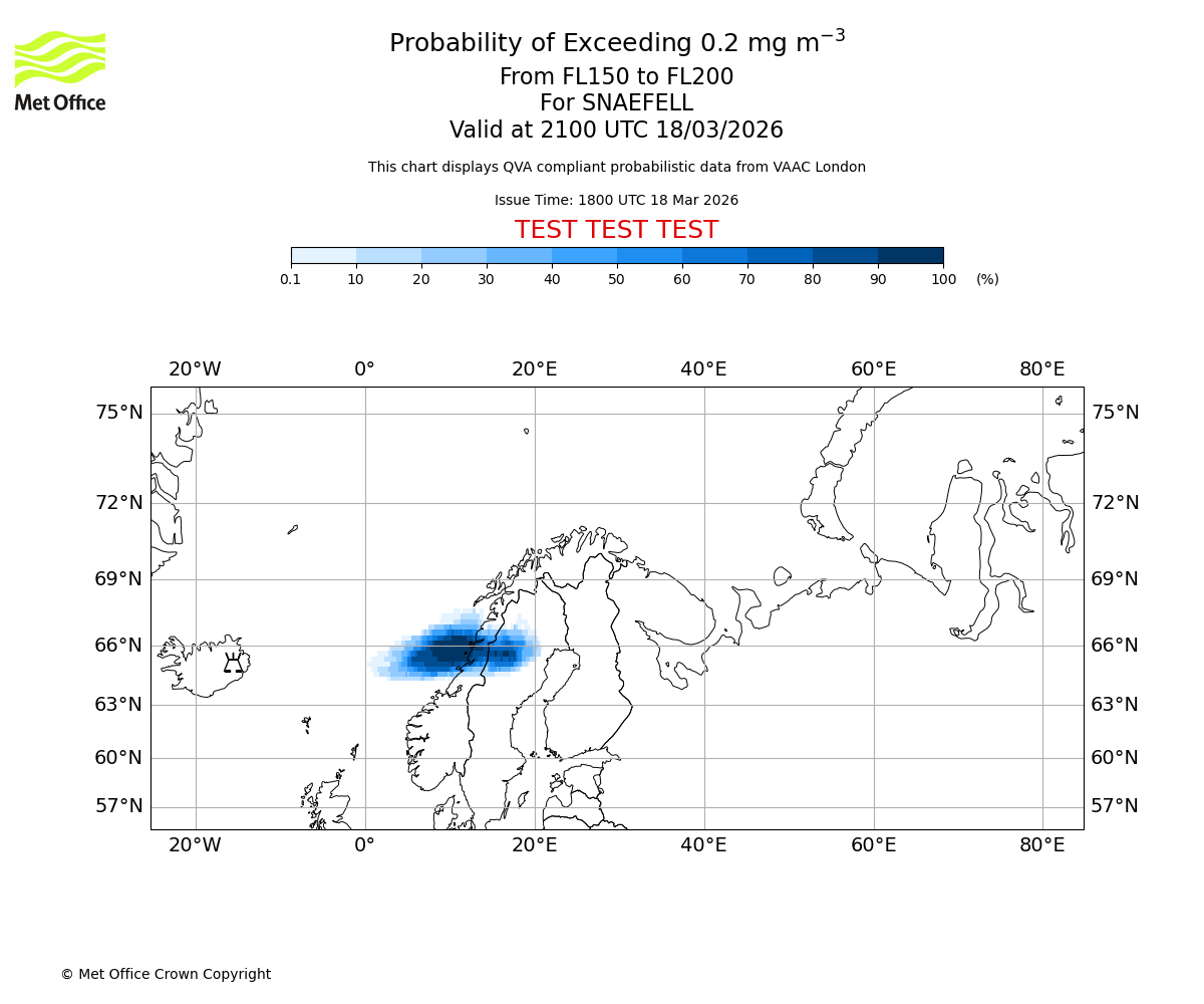 Quantitative Volcanic Ash charts (QVA) are produced in accordance with International Civil Aviation Organization (ICAO) Annex 3 requirements and are provided as well as the London Volcanic Ash Advisory Graphics (VAG) and Advisories (VAA). The lowest QVA threshold (0.2 mg/m³) matches to the areas depicted in the VAA and VAG. Both expected ash concentration and probabilistic forecast information is provided in the chart viewer below for eruptions occurring in the London Volcanic Ash Advisory Centre (VAAC) area of responsibility.