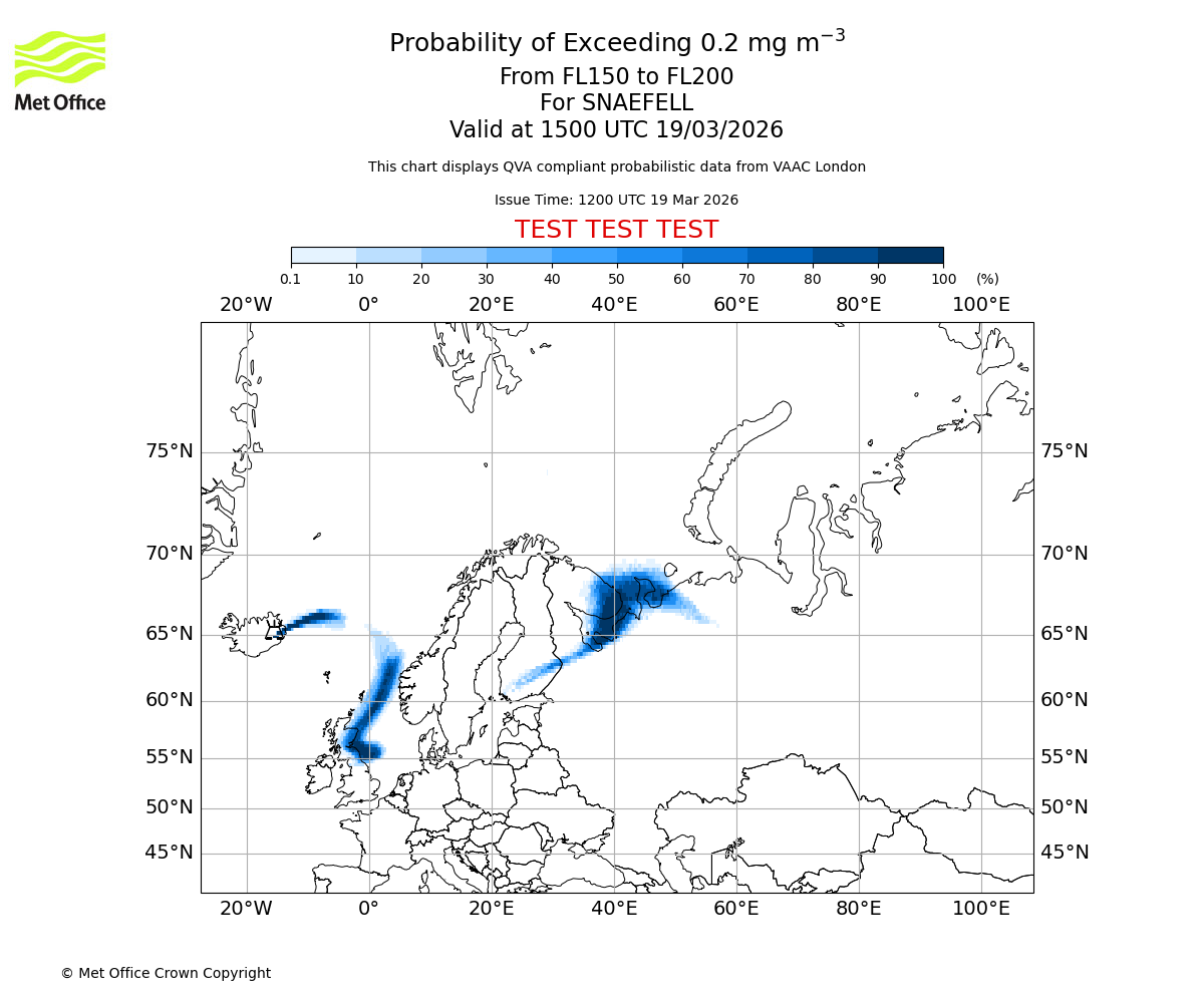 Quantitative Volcanic Ash charts (QVA) are produced in accordance with International Civil Aviation Organization (ICAO) Annex 3 requirements and are provided as well as the London Volcanic Ash Advisory Graphics (VAG) and Advisories (VAA). The lowest QVA threshold (0.2 mg/m³) matches to the areas depicted in the VAA and VAG. Both expected ash concentration and probabilistic forecast information is provided in the chart viewer below for eruptions occurring in the London Volcanic Ash Advisory Centre (VAAC) area of responsibility.